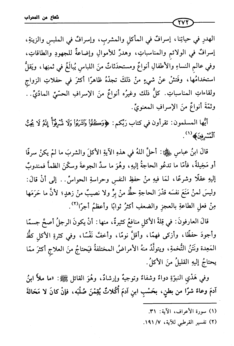 أيُّها المسلمون: تقرأون في كتاب رَبِّكم: {وكُلُوا وَاشْرَبُوا وَلاَ تُسْرِفُوا إِنَّهُ لاَ يُحِبُّ الْمُسْرِفِينَ} (¬1).