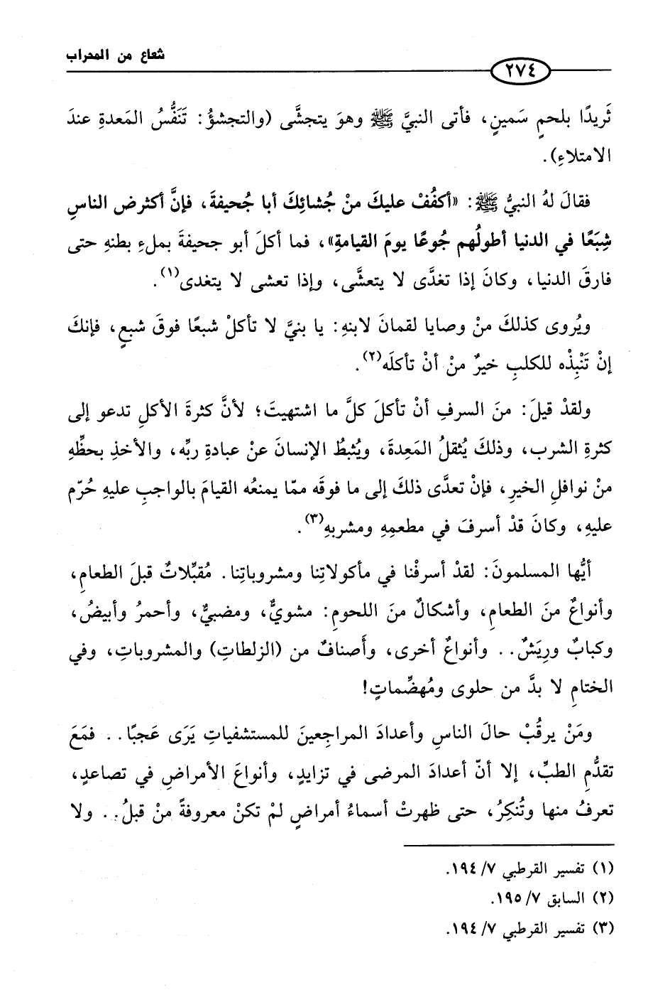 أيُّها المسلمونَ: لقدْ أسرفْنا في مأكولاتِنا ومشروباتِنا. مُقبِّلاتٌ قبلَ الطعامِ، وأنواعٌ منَ الطعامِ، وأشكالٌ منَ اللحومِ: مشويٌّ، ومضبيٌّ، وأحمرُ وأبيضُ، وكبابٌ ورِيَشٌ .. وأنواعٌ أخرى، وأَصنافٌ من (الزلطاتِ) والمشروباتِ، وفي الختامِ لا بدَّ من حلوى ومُهضِّماتٍ!