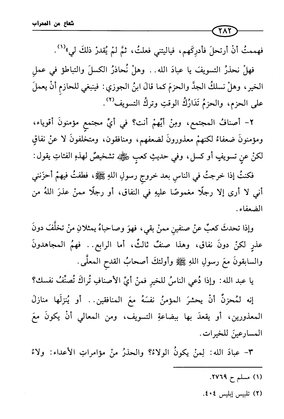 2 - أصنافُ المجتمع، ومِنْ أيِّهمْ أنت؟ في أيِّ مجتمعٍ مؤمنونَ أقوياء، ومؤمنونَ ضعفاءُ لكنهمْ معذورونَ لضعفهم، ومنافقون، ومتخلفونَ لا عنْ نفاقٍ لكنْ عنٍ تسويفٍ أو كسل، وفي حديثِ كعبٍ رضيَ اللهُ عنهُ تشخيصٌ لهذهِ الفئاتِ يقول: