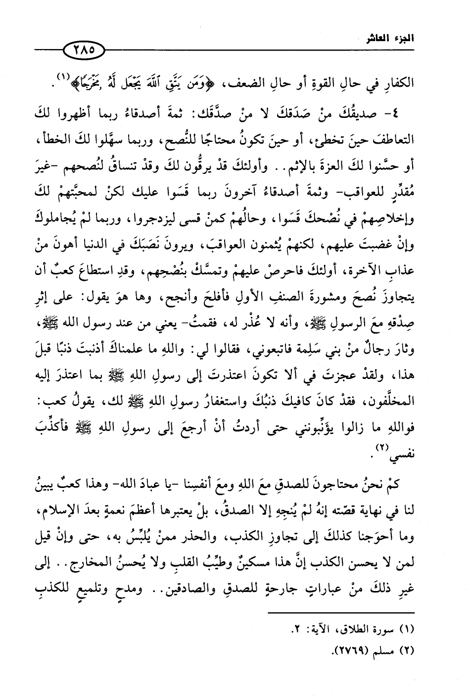 4 - صديقُكَ منْ صَدَقكَ لا منْ صدَّقَك: ثمةَ أصدقاءُ ربما أظهروا لكَ التعاطفَ حينَ تخطئ، أو حينَ تكونُ محتاجًا للنُّصح، وربما سهَّلوا لكَ الخطأ، أو حسَّنوا لكَ العزةَ بالإثم .. وأولئكَ قدْ يرقُّون لكَ وقدْ تنساقُ لنُصحهم- غيرَ مُقدِّرٍ للعواقب- وثمةَ أصدقاءُ آخرونَ ربما قَسَوا عليك لكنْ لمحبَّتهمْ لكَ وإخلاصِهمْ في نُصْحكَ قَسَوا، وحالُهمْ كمنْ قسى ليزدجروا، وربما لمْ يُجاملوكَ وإنْ غضبتَ عليهم، لكنهمْ يُثمنون العواقبَ، ويرونَ نَصَبَكَ في الدنيا أهونَ منْ عذابِ الآخرة، أولئكَ فاحرصْ عليهمْ وتمسَّكْ بنُصْحِهم، وقدِ استطاعَ كعبٌ أن يتجاوزَ نُصحَ ومشورةَ الصنفِ الأولِ فأفلحَ وأنجح، وها هوَ يقول: على إثرِ صِدْقهِ معَ الرسولِ صلى الله عليه وسلم، وأنه لا عُذْر له، فقمتُ- يعني من عند رسول الله صلى الله عليه وسلم، وثارَ رجالٌ منْ بني سَلِمة فاتبعوني، فقالوا لي: واللهِ ما علمناكَ أذنبتَ ذنبًا قبلَ هذا، ولقدْ عجزتَ في ألا تكونَ اعتذرتَ إلى رسولِ اللهِ صلى الله عليه وسلم بما اعتذرَ إليه المخلَّفون، فقدْ كانَ كافيكَ ذنبُكَ واستغفارُ رسولِ اللهِ صلى الله عليه وسلم لك، يقولُ كعب: فواللهِ ما زالوا يؤَنِّبونني حتى أردتُ أنْ أرجعَ إلى رسولِ اللهِ صلى الله عليه وسلم فأكذِّبَ نفسي (¬2).