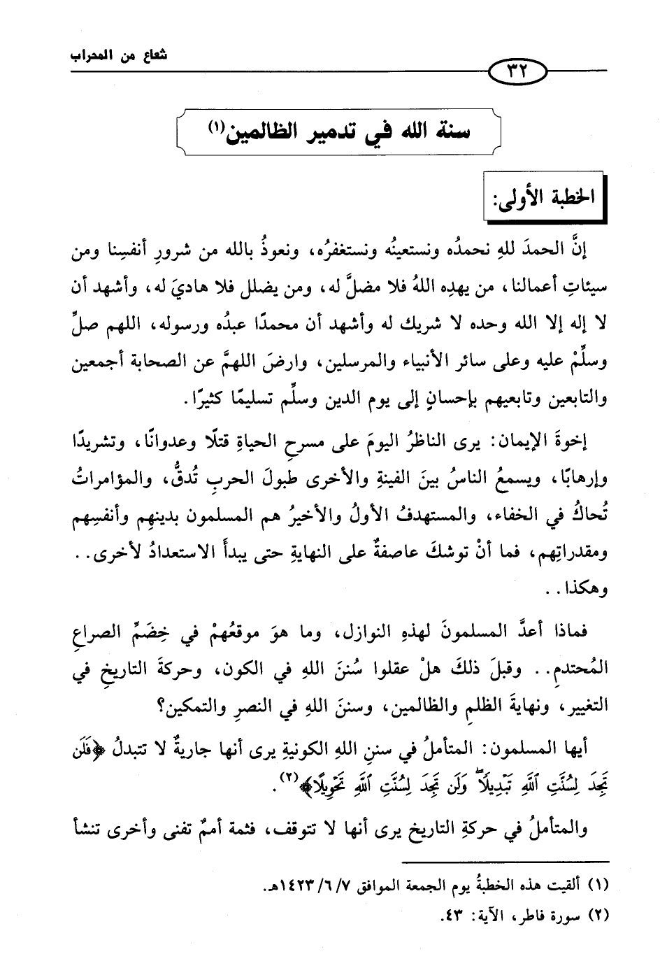فماذا أعدَّ المسلمونَ لهذهِ النوازل، وما هوَ موقعُهمْ في خِضَمِّ الصراعِ المُحتدمِ .. وقبلَ ذلكَ هلْ عقلوا سُننَ اللهِ في الكون، وحركةَ التاريخِ في التغيير، ونهايةَ الظلمِ والظالمين، وسننَ اللهِ في النصرِ والتمكين؟
