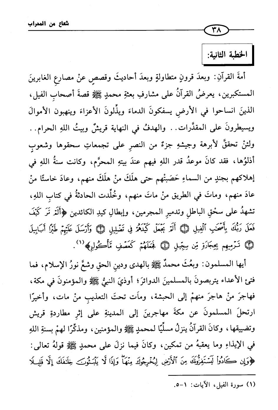 أمةَ القرآنِ: وبعدَ قرونٍ متطاولةٍ وبعدَ أحاديثَ وقصصٍ عنْ مصارعِ الغابرينَ المستكبرين، يعرضُ القرآنُ على مشارفِ بعثةِ محمدٍ صلى الله عليه وسلم قصةَ أصحابِ الفيل، الذينَ انساحوا في الأرضِ يسفكونَ الدماءَ ويذِّلونَ الأعزاءَ وينهبون الأموالَ ويسيطرونَ على المقدَّرات .. والهدفُ في النهاية قريشٌ وبيتُ اللهِ الحرام .. ولئنْ تحققَّ لأبرهة وجيشهِ جزءٌ من النصرِ على تجمعاتِ سحقوها وشعوبٍ أذلوُها، فقد كانَ موعدُ قدر اللهِ فيهم عندَ بيتهِ المحرَّم، وكانت سنةُ اللهِ في إهلاكهم بجندٍ من السماءِ حَصَبتْهم حتى هلَكَ منْ هلَكَ منهم، وعادَ خاسئًا منْ عادَ منهم، وماتَ في الطريق منْ ماتَ منهم، وخُلِّدت الحادثةُ في كتابِ اللهِ، تشهدُ على سحْقِ الباطلِ وتدميرِ المجرمين، وإبطالِ كيدِ الكائدين {أَلَمْ تَرَ كَيْفَ فَعَلَ رَبُّكَ بِأَصْحَابِ الْفِيلِ، أَلَمْ يَجْعَلْ كَيْدَهُمْ فِي تَضْلِيلٍ، وَأَرْسَلَ عَلَيْهِمْ طَيْرًا أَبَابِيلَ، تَرْمِيهِم بِحِجَارَةٍ مِّن سِجِّيلٍ، فَجَعَلَهُمْ كَعَصْفٍ مَّأْكُولٍ} (¬1).