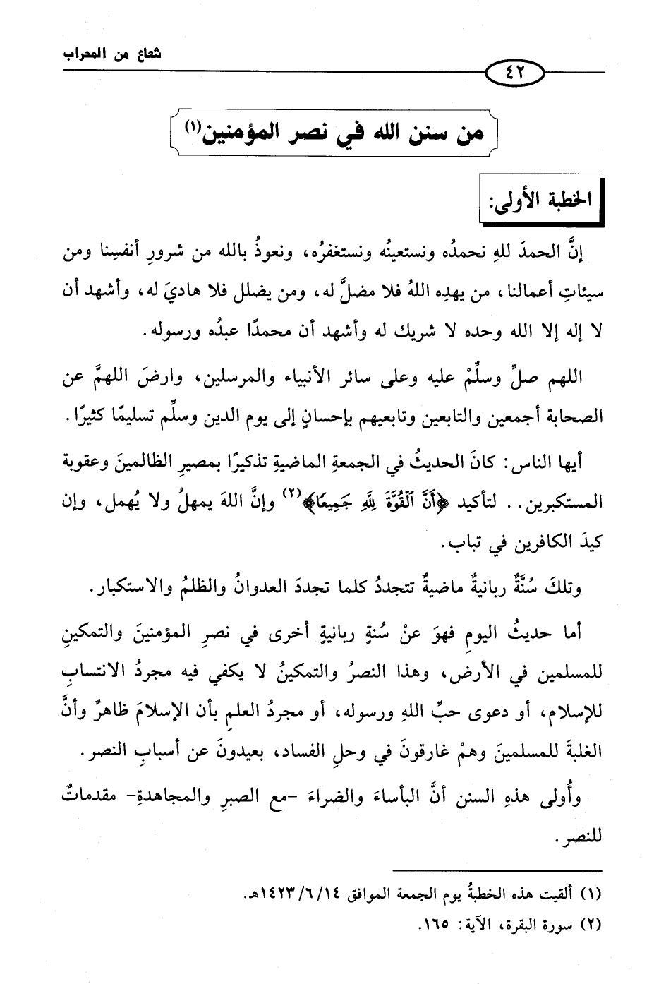 وتلكَ سُنَّةٌ ربانيةٌ ماضيةٌ تتجددُ كلما تجددَ العدوانُ والظلمُ والاستكبار.