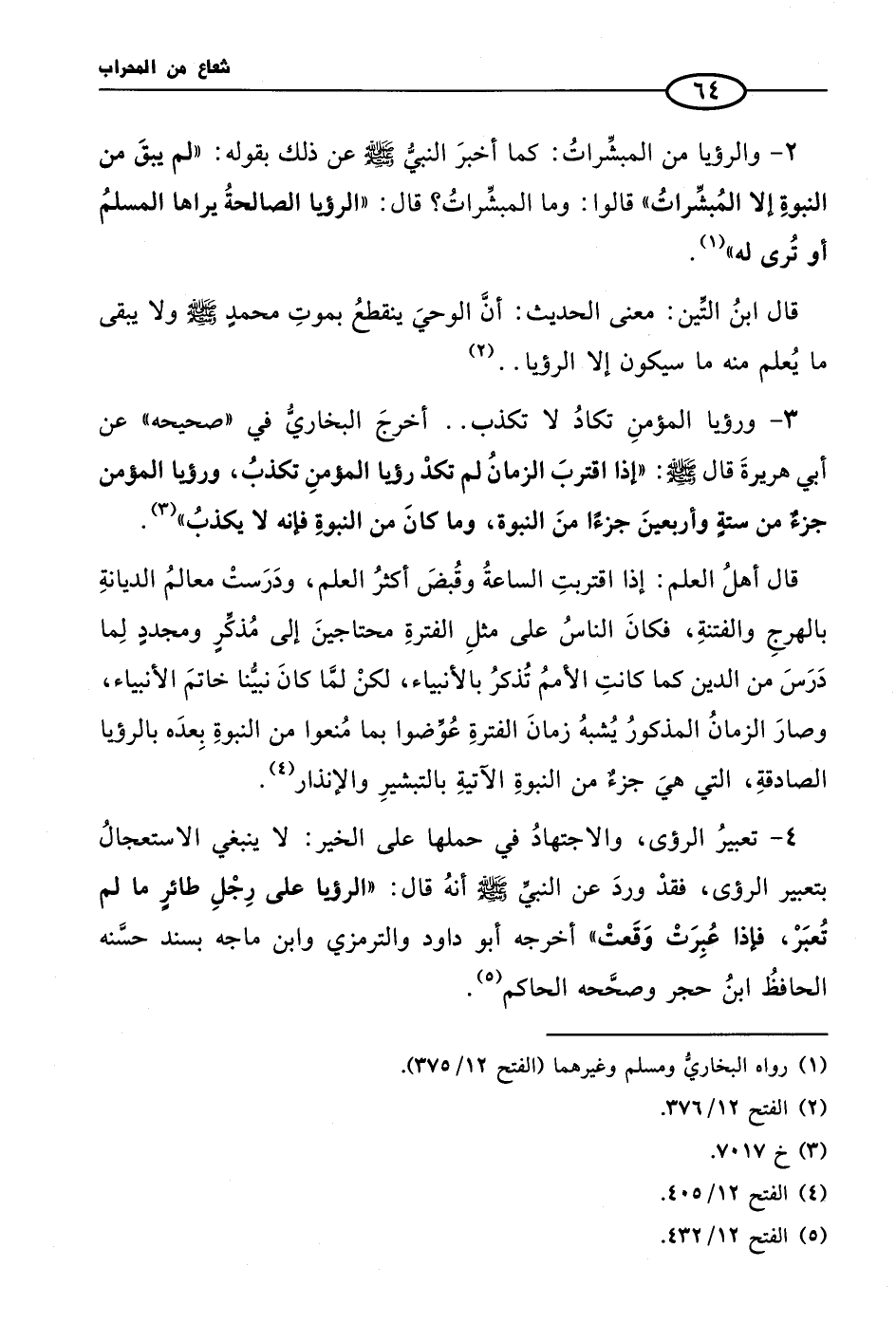 4 - تعبيرُ الرؤى، والاجتهادُ في حملها على الخير: لا ينبغي الاستعجالُ بتعبير الرؤى، فقدْ وردَ عن النبيِّ صلى الله عليه وسلم أنهُ قال: «الرؤيا على رِجْلِ طائرٍ ما لم تُعبَرْ، فإذا عُبِرَتْ وَقَعتْ» أخرجه أبو داود والترمزي وابن ماجه بسند حسَّنه الحافظُ ابنُ حجر وصحَّحه الحاكم (¬5).