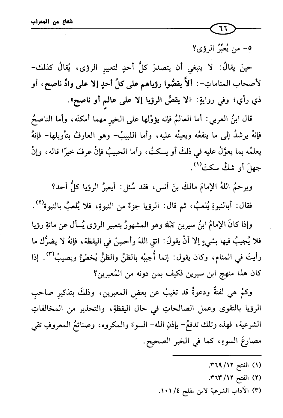 وإذا كانَ الإمامُ ابنُ سيرين- رحمهُ الله- وهو المشهورُ بتعبير الرؤى يُسأل عن مائةِ رؤيا فلا يُجيبُ فيها بشيءٍ إلا أنْ يقولَ: اتقِ اللهَ وأحسِنْ في اليقظة، فإنهُ لا يضرُّك ما رأيتَ في المنام، وكان يقول: إنما أُجيبُه بالظنِّ والظنُّ يُخطئُ ويصيبُ (¬3). إذا كان هذا منهج ابن سيرين فكيف بمن دونه من المُعبرين؟