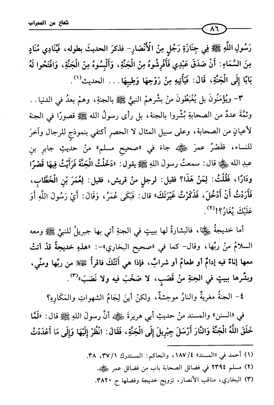 3 - ويُؤْمَنُونَ بل يُغْبَطُونَ منْ بشَّرهمْ النبيُّ صلى الله عليه وسلم بالجنةِ، وهمْ بعدُ في الدنيا .. وثمَّةَ عددٌ من الصحابةِ بُشِّروا بالجنة، بل رأى رسولُ الله صلى الله عليه وسلم قصورًا في الجنة لأعيانٍ من الصحابة، وعلى سبيل المثال لا الحصرِ أكتفي بنموذجٍ للرجال وآخرَ للنساء، فقَصْرُ عمرَ رضيَ اللهُ عنهُ جاءَ في «صحيحِ مسلم» منْ حديثِ جابرِ بنِ عبدِ الله رضيَ اللهُ عنهما قال: سمعتُ رسولَ اللهِ صلى الله عليه وسلم يقول: «دَخَلْتُ الْجَنَّةَ فَرَأَيْتُ فِيهَا قَصْرًا ودَارًا، فَقُلْتُ: لِمَنْ هَذَا؟ فقيل: لرجلٍ منْ قريش، فقيل: لِعُمَرَ بْنِ الْخَطَّابِ، فَأَرَدْتُ أَنْ أَدْخُلَ، فَذَكَرْتُ غَيْرَتَكَ» قال: فَبَكَى عُمَرُ، وَقَالَ: أَيْ رَسُولَ اللَّهِ أَوَ عَلَيْكَ يُغَارُ؟ ! (¬2).