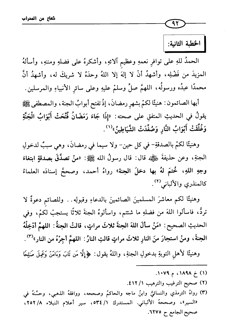 أيها الصائمون: هنيئًا لكمْ بشهرِ رمضانَ، إذْ تفتح أبوابُ الجنة، والمصطفى صلى الله عليه وسلم يقولُ في الحديثِ المتفقِ على صحته: «إِذَا جَاءَ رَمَضَانُ فُتِّحَتْ أَبْوَابُ الْجَنَّةِ وَغُلِّقَتْ أَبْوَابُ النَّارِ وَصُفِّدَتْ الشَّيَاطِينُ» (¬1).