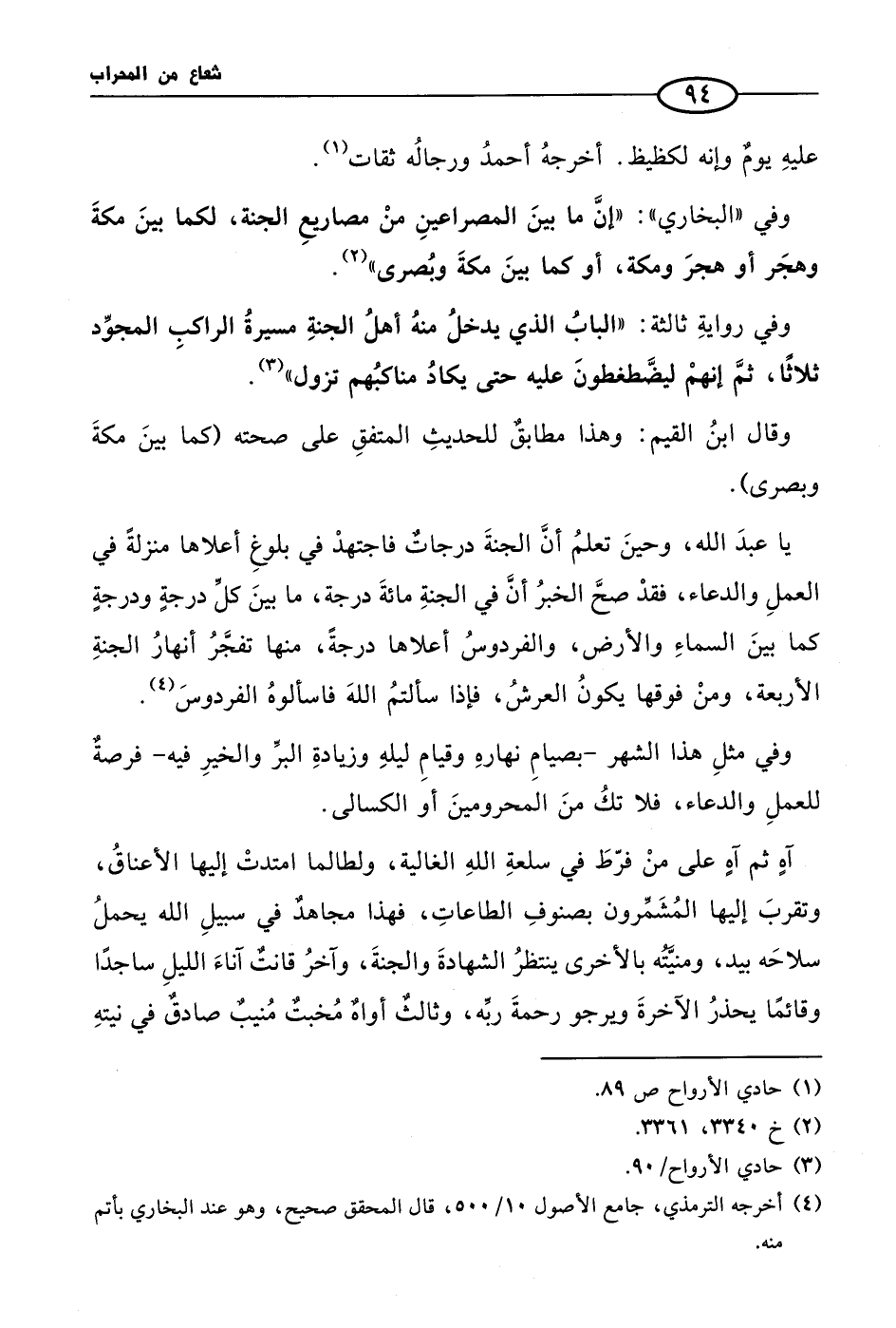 يا عبدَ الله، وحينَ تعلمُ أنَّ الجنةَ درجاتٌ فاجتهدْ في بلوغِ أعلاها منزلةً في العملِ والدعاء، فقدْ صحَّ الخبرُ أنَّ في الجنةِ مائةَ درجة، ما بينَ كلِّ درجةٍ ودرجةٍ كما بينَ السماءِ والأرض، والفردوسُ أعلاها درجةً، منها تفجَّرُ أنهارُ الجنةِ الأربعة، ومنْ فوقها يكونُ العرشُ، فإذا سألتمُ اللهَ فاسألوهُ الفردوسَ (¬4).