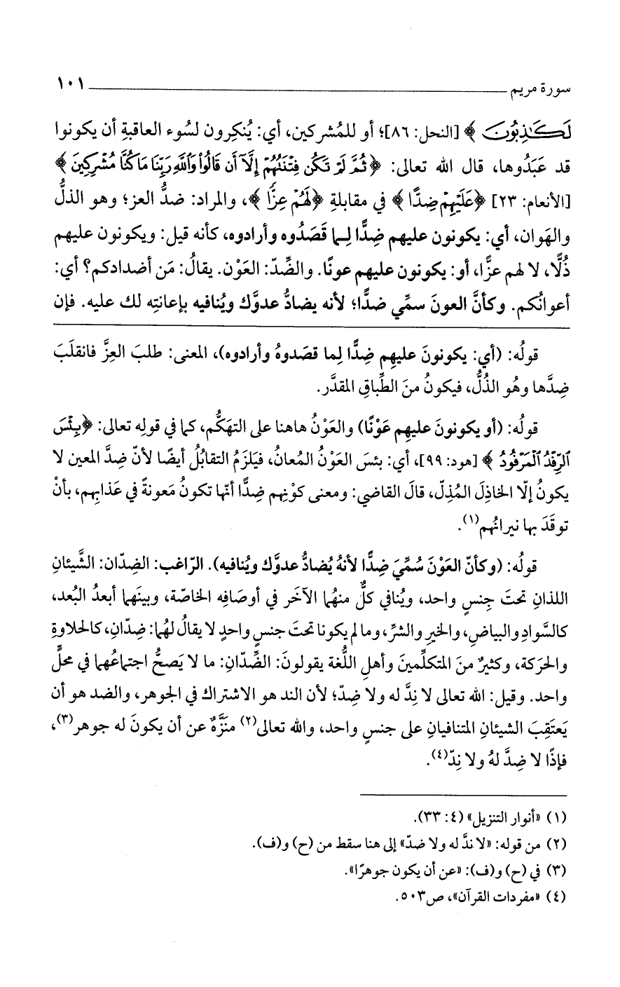 قوله: (وأن العون سُمي ضداً لأنه يُضاد عدوك وينافيه). الراغب: الضدان: الشيئان اللذان تحت جنس واحد، وينافي كل منهما الآخر في أوصافه الخاصة، وبينهما أبعد البعد، كالسواد والبياض، والخير والشر، وما لم يكونا تحت جنسٍ واحدٍ لا يقال لهما: ضدان، كالحلاوة والحركة، وكثيرٌ من المتكلمين وأهل اللغة يقولون: الضدان: ما لايصح اجتماعهما في محل واحد. وقيل: الله تعالى لا ند له ولا ضد؛ لأن الند هو الاشتراك في الجوهر، والضد هو أن يعتقب الشيئان المتنافيان على جنسٍ واحد، والله تعالى منزهٌ عن أن يكون له جوهر، فإذاً لا ضد له ولا ند.
