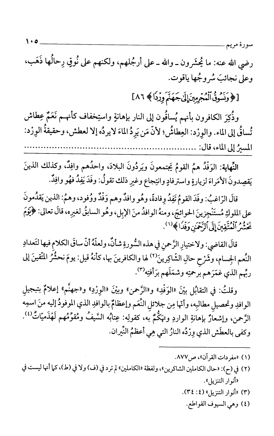 وقلتُ: في التقابل بين "الوفد" و"الرحمن" وبين "الورد" و"جهنم" إعلامٌ بتبجيل الوافد وتحصيل مطالبه، وأنها من جلائل النعم وإعظامٌ بالوافد الذي الموفود إليه من اسمه الرحمن، وإشعارٌ بإهانة الوارد وتهكمٌ به، كقوله: عتابه السيفُ ومقومهم لهذمياتٌ. وكفى بالعطش الذي ورده النار التي هي أعظم النيران.