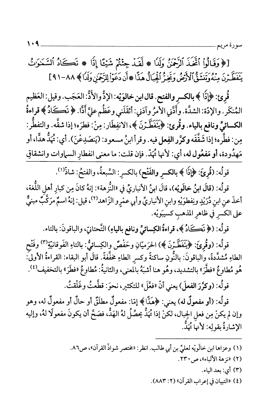 قرئ: (إِدًّا) بالكسر والفتح. قال ابن خالويه: الإدّ والأدّ: العجب. وقيل: العظيم المنكر. والإدّة: الشدّة. وأدنى الأمر وآدنى: أثقلنى وعظُم علىّ أدّا (تَكادُ) قراءة الكسائي ونافع بالياء. وقرئ: (يَتَفَطَرنَ) الانفطار من فطره إذا شقه. والتفطر، من فطره إذا شققه وكرر الفعل فيه. وقرأ ابن مسعود: (يَنصَدِعْنَ)، أى: تهد هدّا، أو مهدودة، أو مفعول له، أى: لأنها تهدّ. فإن قلت: ما معنى انفطار السموات وانشقاق