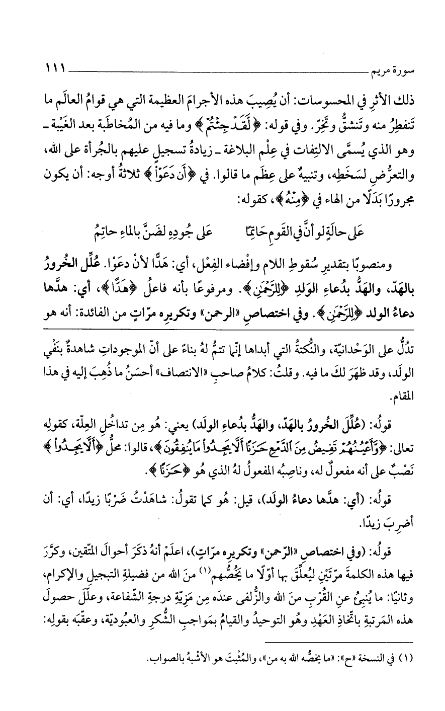 قوله: (وفي اختصاص "الرحمن" وتكريره مرات)، اعلم أنه ذكر أحوال المتقين، وكرر فيها هذه الكلمة مرتين ليُعلق بها أولاً ما يخصهم من الله من فضيلة التبجيل والإكرام، وثانياً: ما ينبئ عن القرب من الله والزلفى عنده من مزية درجة الشفاعة، وعلل حصول هذه المرتبة باتخاذ العهد وهو التوحيد والقيام بمواجب الشكر والعبودية، وعقبه بقوله: