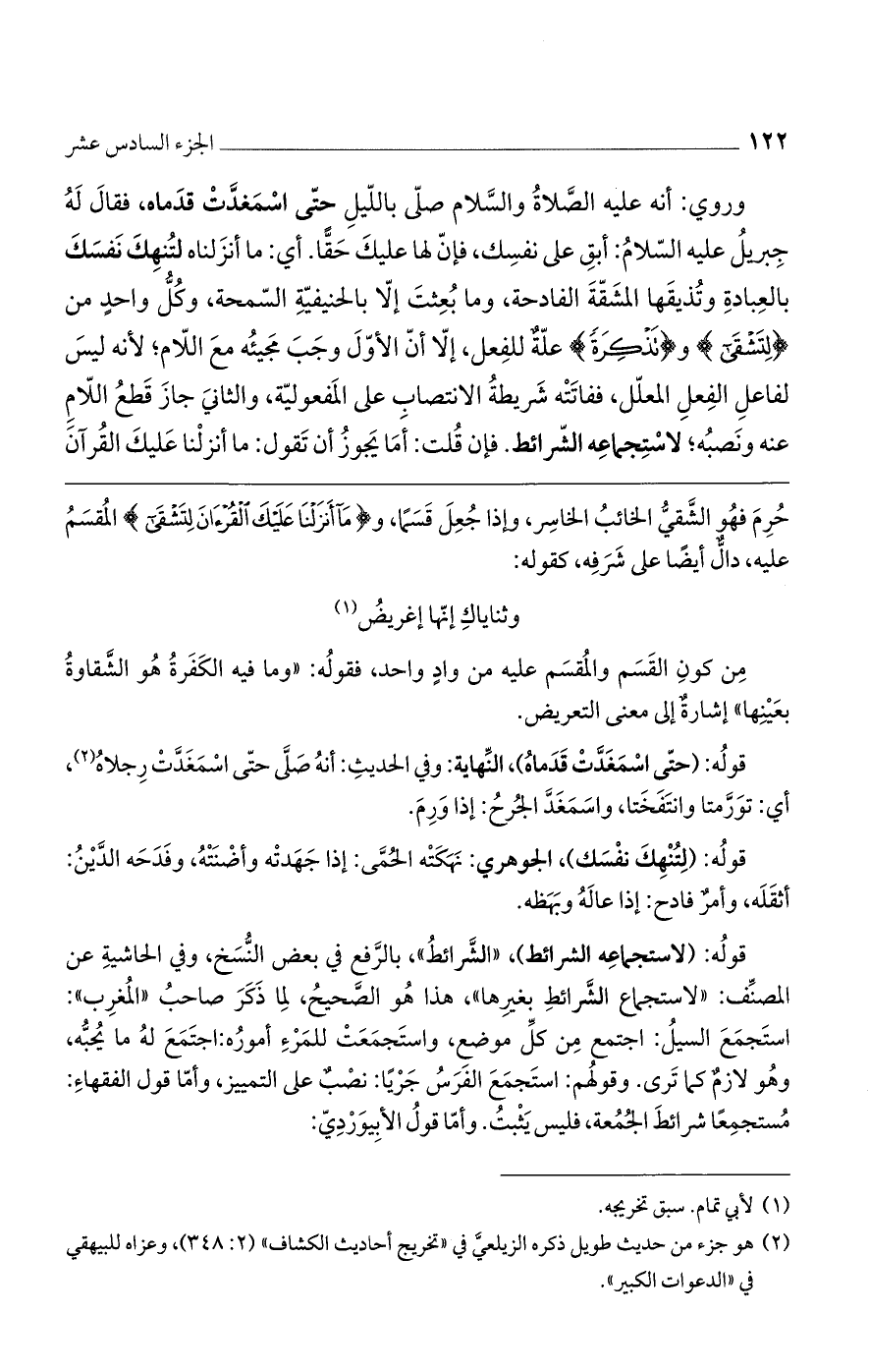 قوله: (حتى اسمغدت قدماه)، النهاية: وفي الحديث: أنه صلى حتى اسمغدت رجلاه، أي: تورمتا وانتفختا، واسمغد الجُرحُ: إذا ورم.