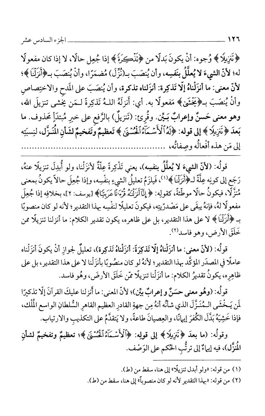 (تَنْزِيلًا) وُجوه: أن يكون بدلا من (تذكرة) إذا جعل حالا، لا إذا كان مفعولا له لأن الشيء لا يعلل بنفسه، وأن ينصب ب (نُزًلَ) مضمرا، وأن ينصب بـ (أنزلنا)، لأن معنى: ما أنزلناه إلا تذكرة: أنزلناه تذكرة، وأن ينصب على المدح والاختصاص وأن ينصب بـ (يخشى) مفعولا به، أى: أنزله الله تذكرة لمن يخشى تنزيل الله، وهو معنى حسن وإعراب بين. وقرىّ: (تنزيل)، بالرفع على خبر مبتدأ محذوف. ما بعد (تَنْزِيلًا) إلى قوله: (لَهُ الْأَسْماءُ الْحُسْنى) تعظيم وتفخيم لشأن المنزل، لنسبته إلى من هذه أفعاله وصفاته،