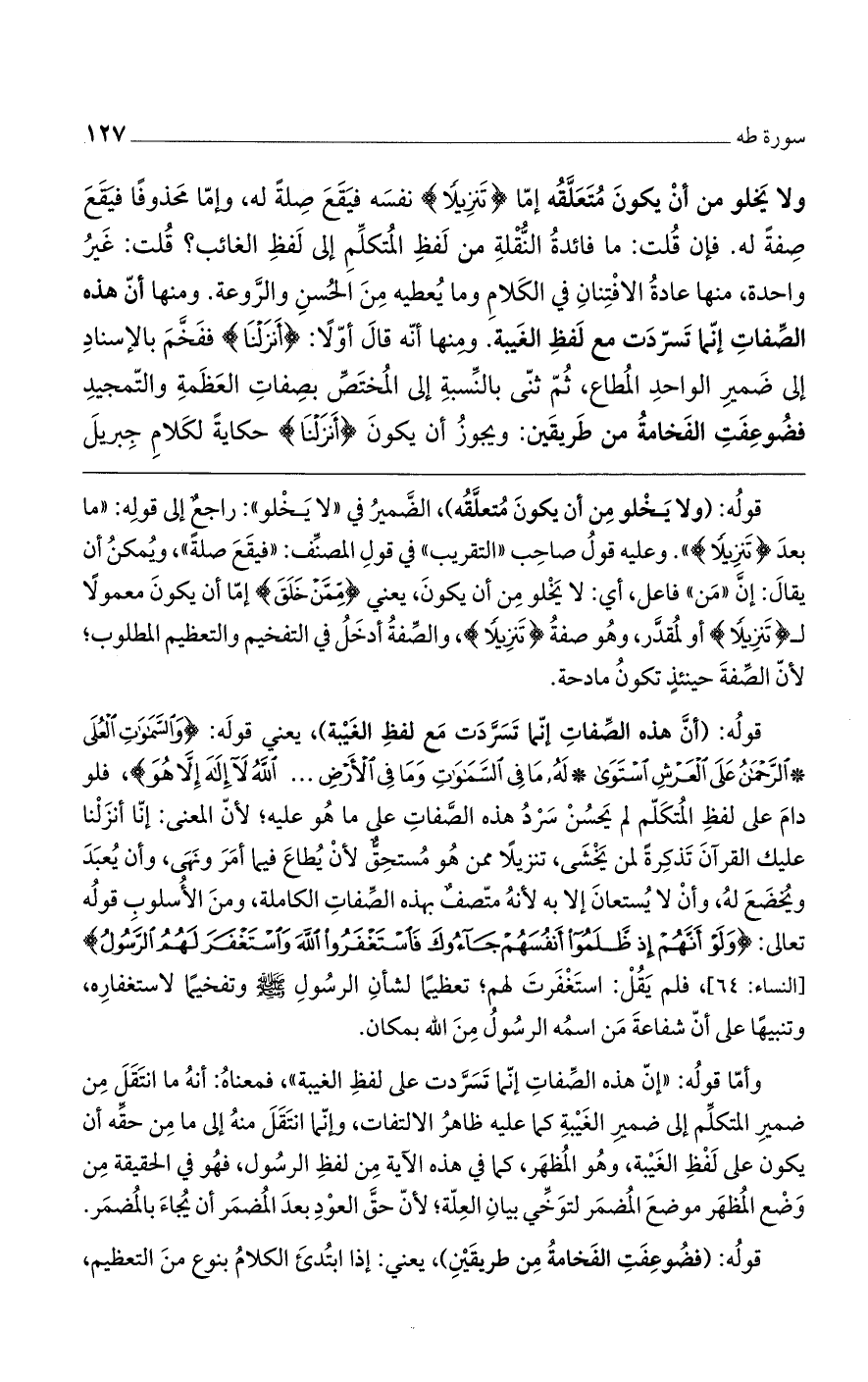 قوله: (أن هذه الصفات إنما تسردت مع لفظ الغيبة)، يعني قوله: (وَالسَّمَوَاتِ الْعُلا (4) الرَّحْمَنُ عَلَى الْعَرْشِ اسْتَوَى* لَهُ مَا فِي السَّمَوَاتِ وَمَا فِي الأَرْضِ ... اللَّهُ لا إِلَهَ إِلاَّ هُوَ)، فلو دام على لفظ المتكلم لم يحسن سرد هذه الصفات على ما هو عليه؛ لأن المعنى: إنا أنزلنا عليك القرآن تذكرة لمن يخشى، تنزيلاً ممن هو مستحقٌّ لأن يُطاعَ فيما أمرَ ونهى، وأن يُعبد ويُخضع له، وأن لا يُستعان إلا به لأنه متصفٌ بهذه الصفات الكاملة، ومن الأسلوب قوله تعالى: (وَلَوْ أَنَّهُمْ إِذْ ظَلَمُوا أَنفُسَهُمْ جَاءُوكَ فَاسْتَغْفَرُوا اللَّهَ وَاسْتَغْفَرَ لَهُمْ الرَّسُولُ) بالنساء: 64]، فلم يقل: استغفرت لهم؛ تعظيماً لشأن الرسول صلى الله عليه وسلم وتفخيماً لاستغفاره، وتنبيهاً على أن شفاعة من اسمه الرسول من الله بمكان.