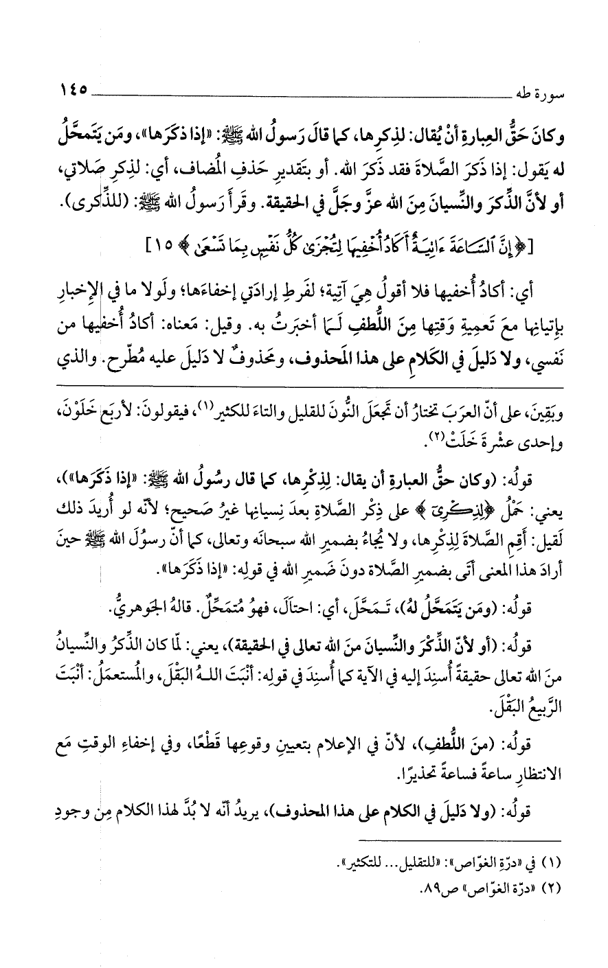 قوله: (وكان حق العبارة أن يقال: لذكرها، كما قال رسول الله صلى الله عليه وسلم: "إذا ذكرها")، يعني: حمل (لِذِكْرِي) على ذكر الصلاة بعد نسيانها غير صحيح؛ لأنه لو أريد ذلك لقيل: أقم الصلاة لذكرها، ولا يُجاء بضمير الله سبحانه وتعالى، كما أن رسول الله صلى الله عليه وسلم حين أراد هذا المعنى أتى بضمير الصلاة دون ضمير الله في قوله: "إذا ذكرها".