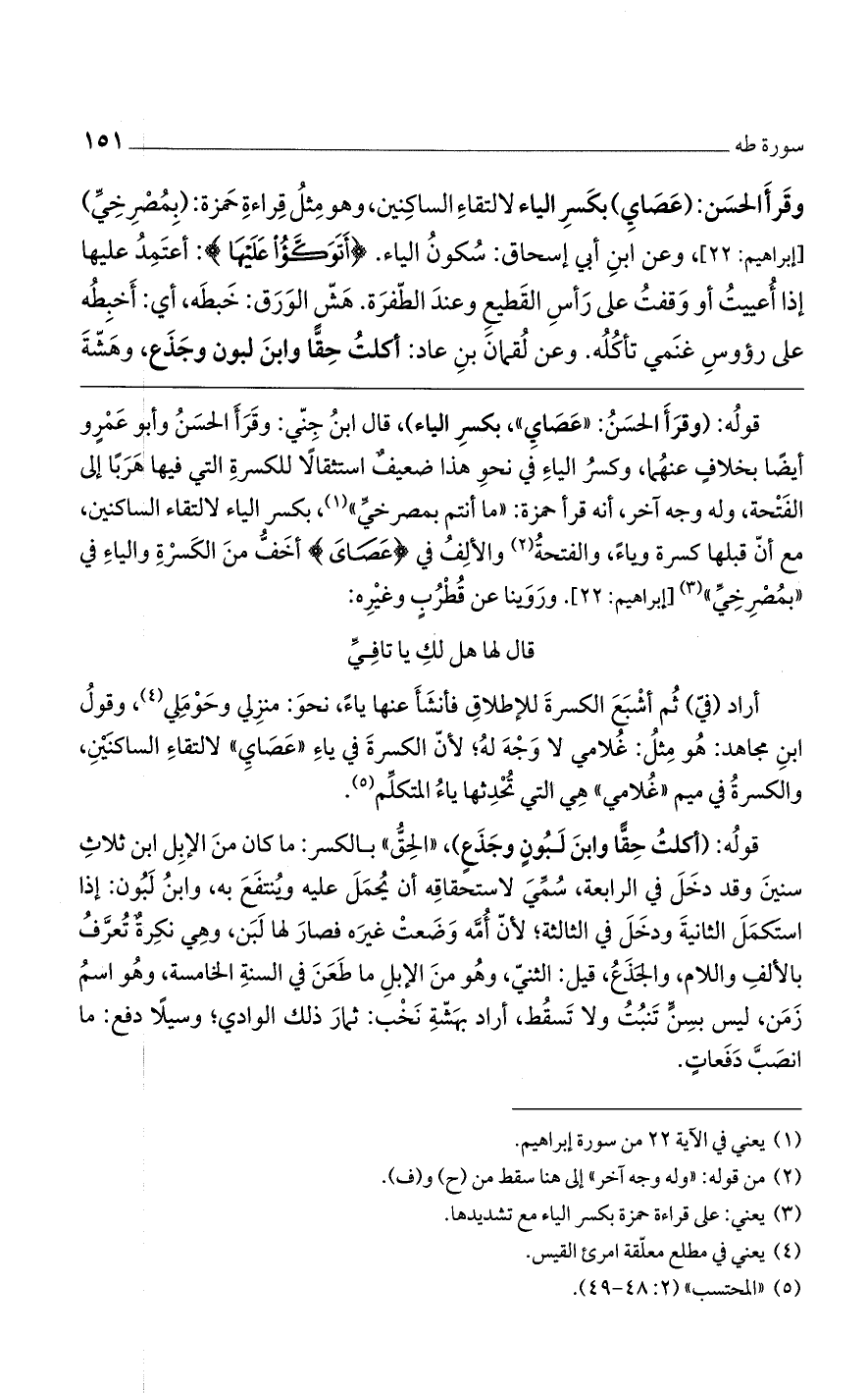 قوله: (وقرأ الحسن: "عصاي"، بكسر الياء)، قال ابن جني: وقرأ الحسن وأبو عمرو أيضاً بخلاف عنهما، وكسرُ الياء في نحو هذا ضعيفٌ استثقالاً للكسرة التي فيها هرباً إلى الفتحة، وله وجه آخر، أنه قرأ حمزة: "ما أنتم بمصرخي"، بكسر الياء لالتقاء الساكنين، مع أن قبلها كرة وياء، والفتحة والألف في (عَصَايَ) أخف من الكسرة والياء في "بمصرخي" [إبراهيم: 22] وروينا عن قُطربٍ وغيره: