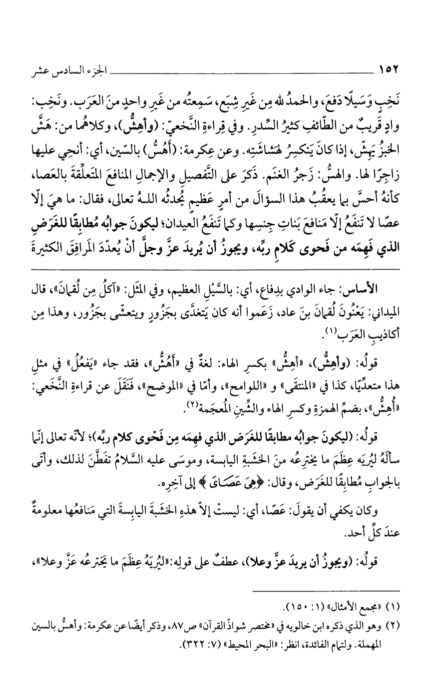 نخب وسيلا دفع، والحمد لله من غير شبع، سمعته من غير واحد من العرب. ونخب: واد قريب من الطائف كثير السدر. وفي قراءة النخعي: (وأهش)، وكلاهما من هش الخبز يهش: إذا كان ينكسر لهشاشته. وعن عكرمة: (أهس) بالسين، أى: أنحى عليها زاجرا لها. والهس: زجر الغنم. ذكر على التفصيل والإجمال المنافع المتعلقة بالعصا، كأنه أحس بما يعقب هذا السؤال من أمر عظيم يحدثه الله تعالى فقال: ما هي إلا عصا لا تنفع إلا منافع بنات جنسها وكما تنفع العيدان، ليكون جوابه مطابقا للغرض الذي فهمه من فحوى كلام ربه. ويجوز أن يريد عزّ وجلّ أن يعدّد المرافق الكثيرة