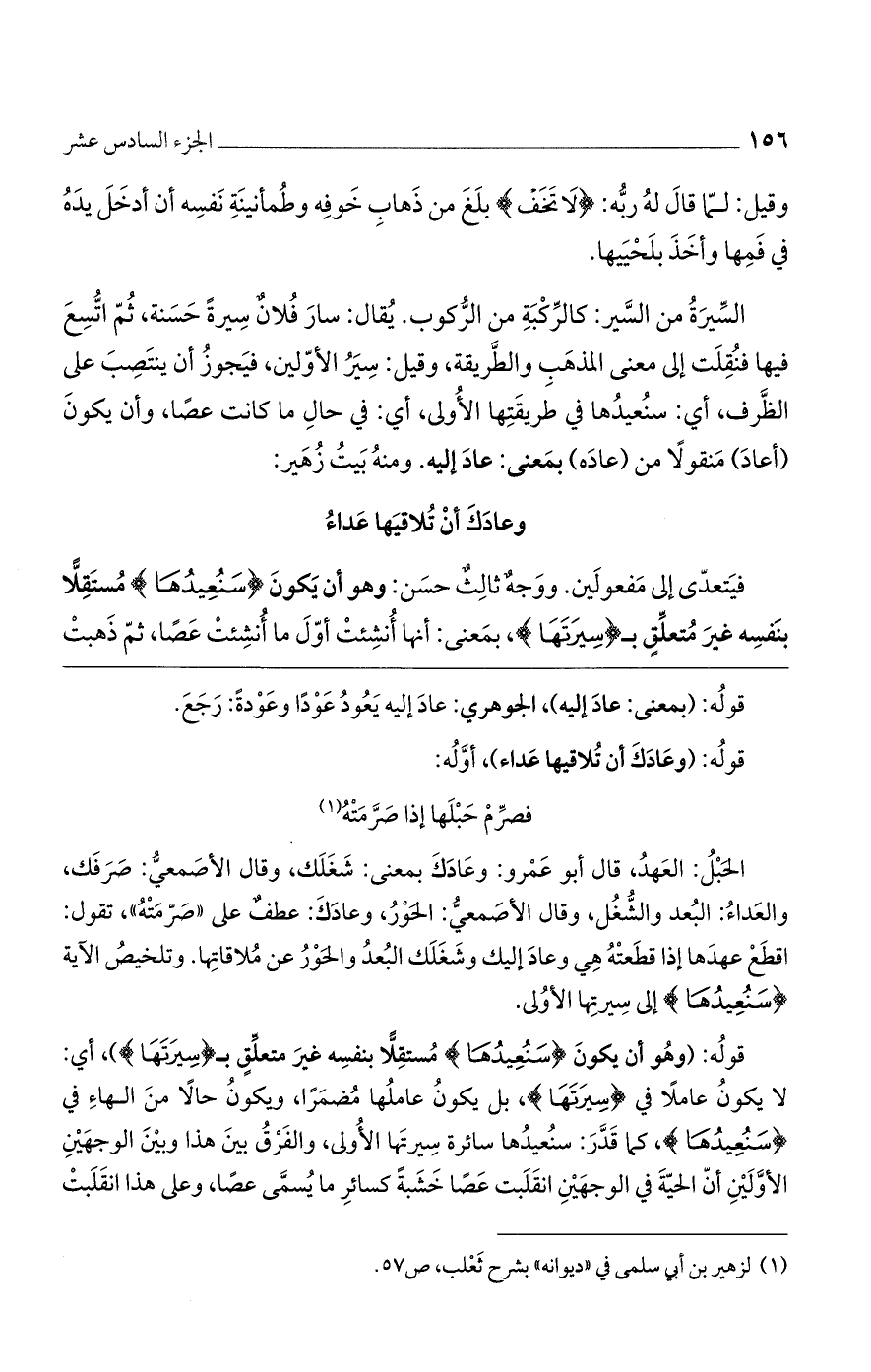 قوله: (وهو أن يكون (سَنُعِيدُهَا) مستقلاً بنفسه غير متعلقٍ بـ (سِيرَتَهَا))، أي: لا يكون عاملاً في (سِيرَتَهَا)، بل يكون عاملها مضمراً، ويكون حالاً من الهاء في (سَنُعِيدُهَا)، كما قدر: سنعيدها سائرة سيرتها الأولى، والفرقُ بين هذا وبين الوجهين الأولين أن الحية في الوجهين انقلبت عصا خشبةً كسائر ما يُسمى عصا، على هذا انقلبت