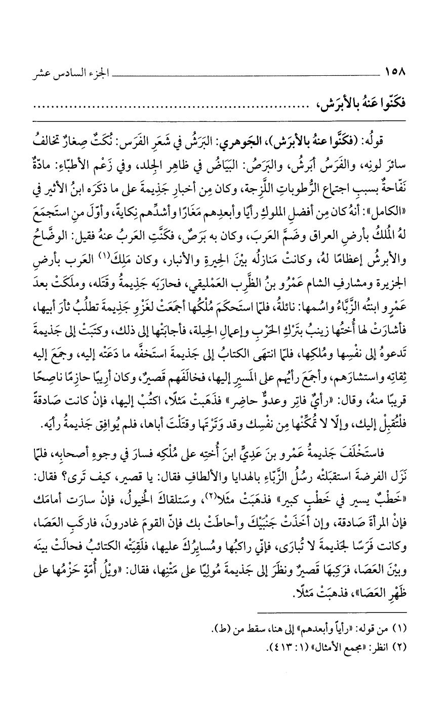 قوله: (فكنوا عنه بالأبرش)، الجوهري: البرشُ في شعر الفرس: نكتٌ صغارٌ تخالفُ سائر لونهن والفرس أبرش، والبرص: البياض في ظاهر الجلد، وفي زعم الأطباء: مادة نفاحةٌ بسبب اجتماع الرطوبات اللزجة، وكان من أخبار جذيمة على ما ذكره ابن الأثير في "الكامل": أنه كان من أفضل الملوك رأياً وأبعدهم مغاراً وأشدهم نكاية، وأول من استجمع له الملك بأرض العراق وضم العرب، وكان به برص، فكنت العرب عنه فقيل: الوضاح والأبرش إعظاماً له، وكانت منازله بين الحيرة والأنبار، وكان ملك العرب بأرض الجزرة ومشارف الشام عمرو بن الظرب العمليقي، فحاربه جذيمة وقتله، وملكت بعد عمرو ابنته الزباء واسمها: نائلة، فلما استحكم مُلكها أجمعت لغزو جذيمة تطلب ثأر أبيها، فأشارت لها أختها زينب بترك الحرب وإعمال الحيلة، فأجابتها إلى ذلك، وكتبت إلى جذيمة تدعوه على نفسها وملكها، فلما انتهى الكتاب إلى جذيمة استخفه ما دعته إليه، وجمع إليه ثقاته واستشارهم، وأجمع رأيهم على المسير إليها، فخالفهم قصير، وكان أريباً حازماً ناصحاً قريباً منه، وقال: "رأيٌ فاتر وعدو حاضر" فذهبت مثلاً، اكتب إليها، فإن كانت صادقة فلتقبل إليك، وإلا لا تمكنها من نفسك وقد وترتها وقتلت أباها، فلم يُوافق جذيمة رأيه.