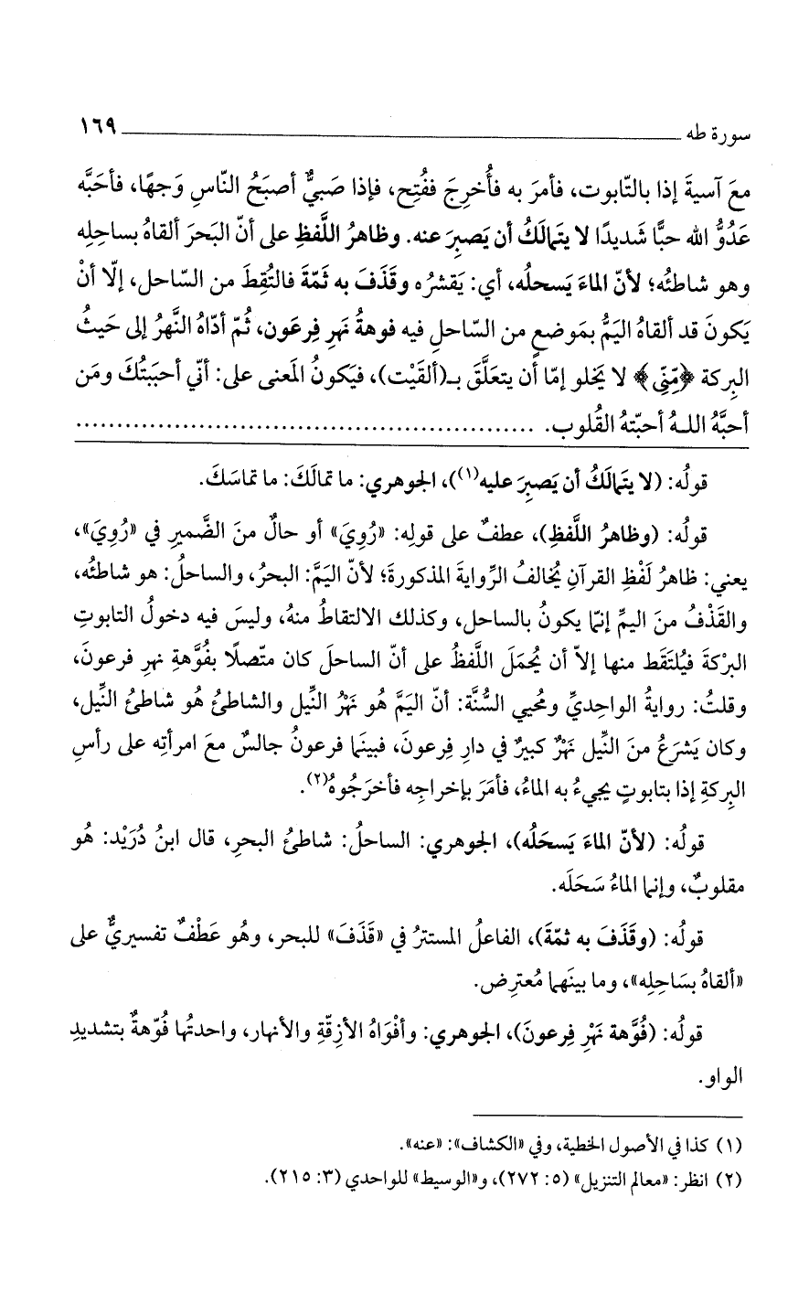 قوله: (وظاهر اللفظ)، عطفٌ على قوله: "رُوي" أو حالٌ من الضمير في "رُويَ"، يعني ظاهر لفظ القرآن يخالف الرواية المذكورة؛ لأن اليم: البحر، الساحل: هو شاطئه، والقذف من اليم إنما يكون بالساحل، وكذلك الالتقاط منه، وليس فيه دخول التابوت البركة فيلتقط منها إلا أن يُحمل اللفظُ على أن الساحل كان متصلاً بفوهة نهر فرعون، وقلتُ: رواية الواحدي ومحيي السنة: أن اليم هو نهر النيل والشاطئ هو شاطئ النيل، وكان يشرعُ من النيل نهر كبيرٌ في دار فرعون، فبينما فرعون جالس مع امرأته على رأس البركة إذا بتابوت يجيء به الماء، فأمر بإخراجه فأخرجوه.