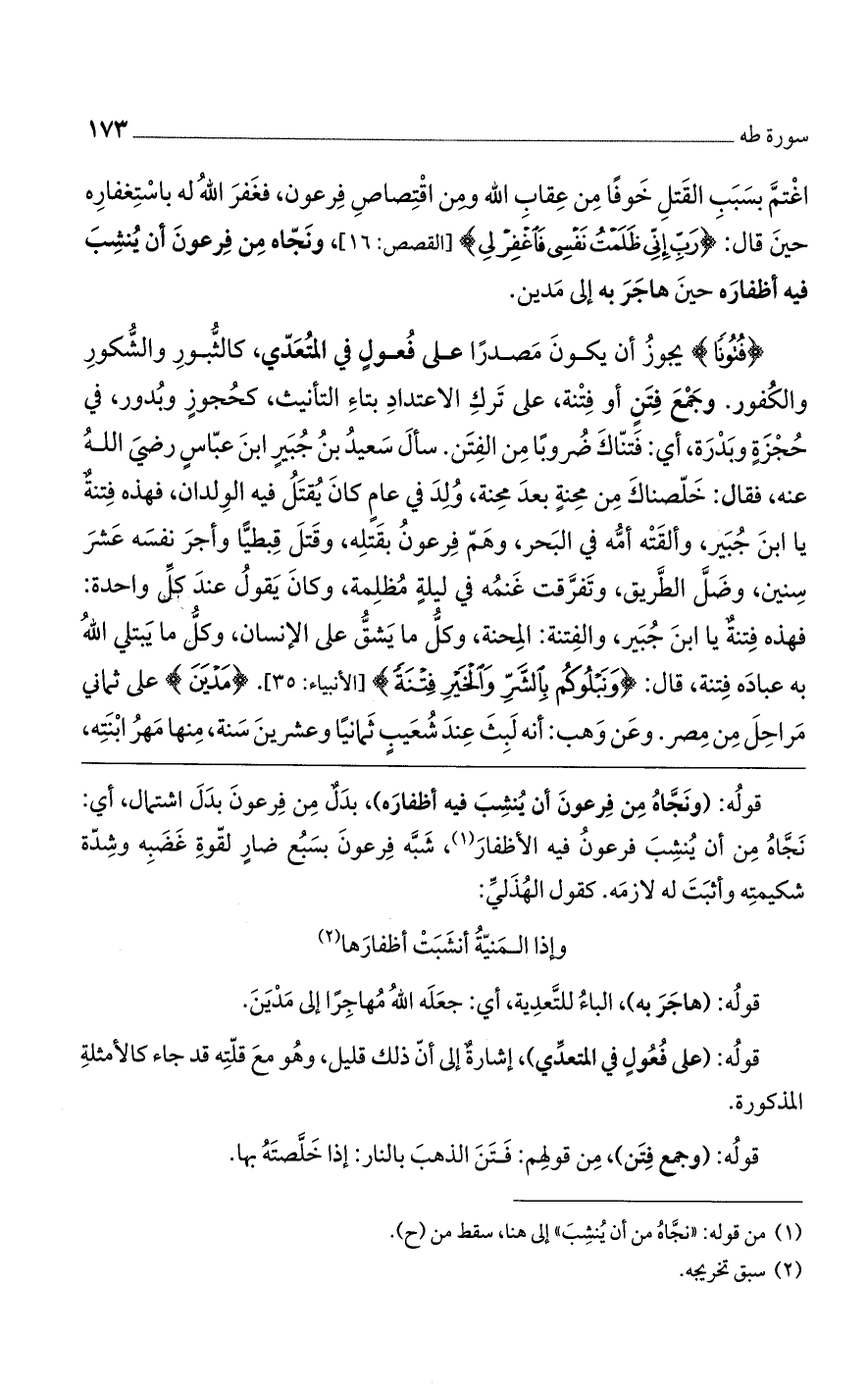 (فُتُوناً) يجوز أن يكون مصدرا على فعول في المتعدّى، كالثبور والشكور والكفور. وجمع فتن أو فتنة، على ترك الاعتداد بتاء التأنيث، كحجوز وبدور، في حجزة وبدرة: أى فتناك ضروبا من الفتن. سأل سعيد بن جبير ابن عباس رضى الله عنه، فقال: خلصناك من محنة بعد محنة: ولد في عام كان يقتل فيه الولدان، فهذه فتنة يا ابن جبير. وألقته أمّه في البحر. وهمّ فرعون بقتله. وقتل قبطيا. وأجر نفسه عشر سنين. وضلّ الطريق وتفرّقت غنمه في ليلة مظلمة، وكان يقول عند كل واحدة: فهذه فتنة يا ابن جبير. والفتنة: المحنة، وكل ما يشق على الإنسان. وكل ما يبتلى الله به عباده: فتنة. قال (وَنَبْلُوكُمْ بِالشَّرِّ وَالْخَيْرِ فِتْنَةً)] الأنبياء: 35 [. (مَدْيَنَ) على ثماني مراحل من مصر. وعن وهب: أنه لبث عند شعيب ثمانيا وعشرين سنة، منها مهر ابنته،