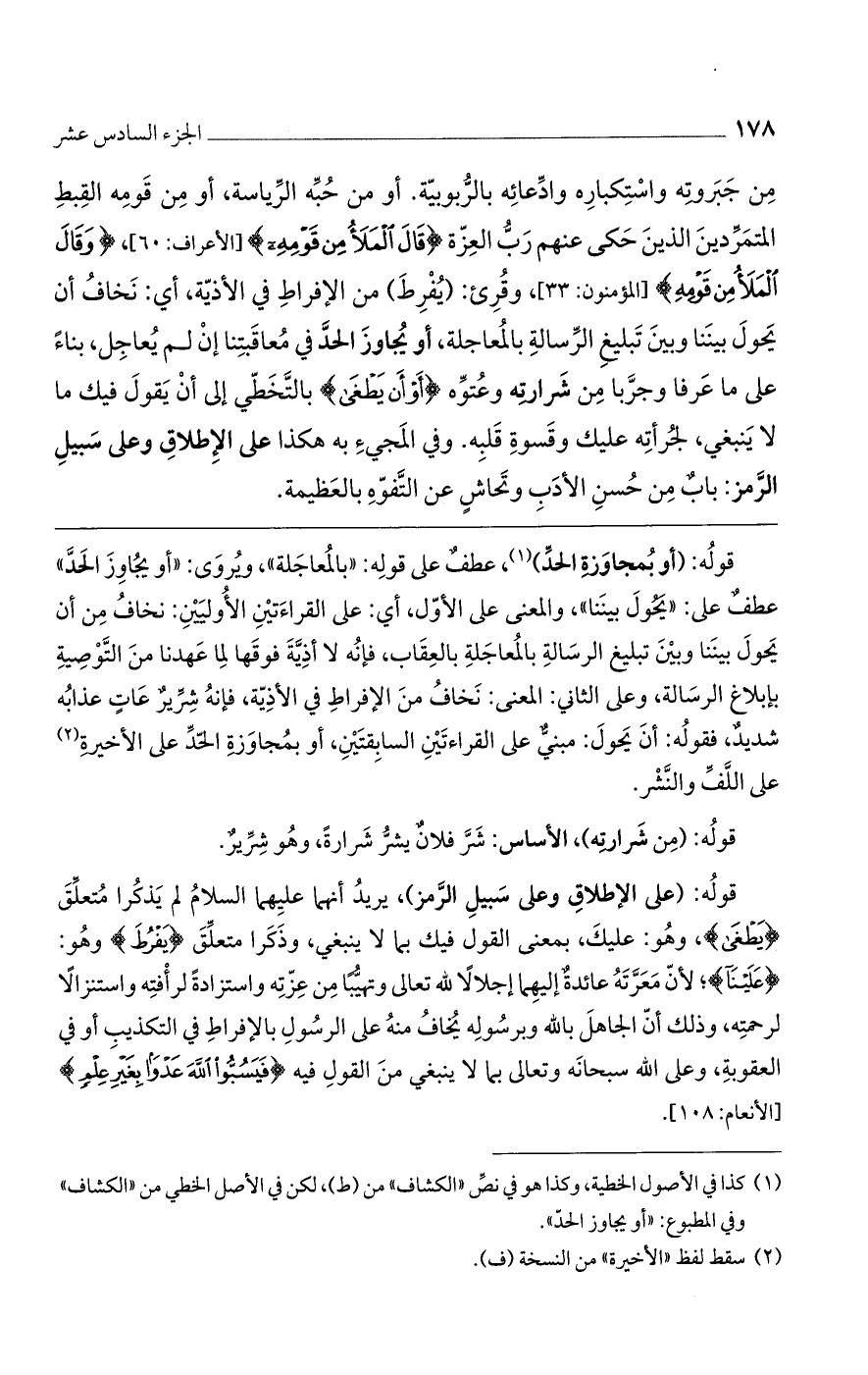 قوله: (أو بمجاوزة الحد)، عطفٌ على قوله: "بالمعاجلة"، ويروى: "أو يجاوز الحد" عطفٌ على: "يحول بيننا"، والمعنى على الأول، أي: على القراءتين الأوليين: نخاف من أن يحول بيننا وبين تبليغ الرسالة بالمعاجلة بالعقاب، فإنه لا أذية فوقها لماعهدنا من التوصية بإبلاغ الرسالة، وعلى الثاني المعنى: نخاف من الإفراط في الأذية، فإنه شرير عاتٍ عذابه شديدٌ، فقوله: أن يحول: مبني على القراءتين السابقتين، أو بمجاوزة الحد على الأخيرة على اللف والنشر.