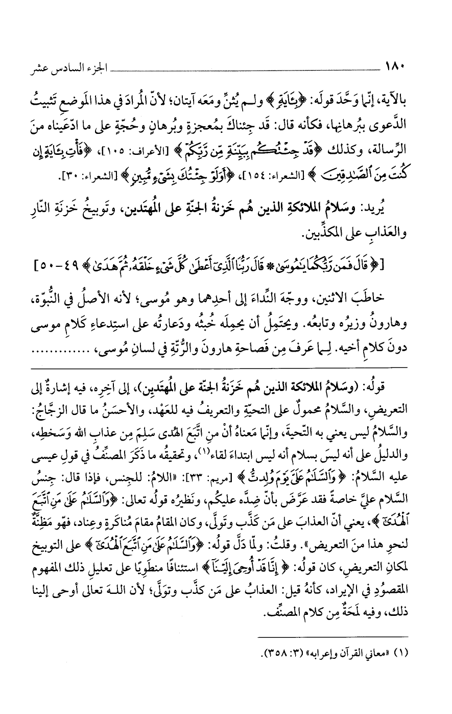 قوله: (وسلام الملائكة الذين هم خزنة الجنة على المهتدين)، إلى آخره، فيه إشارة إلى التعريض، والسلام محمول على التحية والتعريف فيه للعهد، والأحسن ما قال الزجاج: والسلام ليس يعني به التحية، وإنما معناه أن من اتبع الهدى سلم من عذاب الله وسخطه، الدليل على أنه ليس بسلام أنه ليس ابتداء لقاء، وتحقيقه ما ذكر المصنف في قول عيسى عليه السلام: (وَالسَّلامُ عَلَيَّ يَوْمَ وُلِدْتُ) [مريم: 33]: "اللام: للجنس، فإذا قال: جنسُ السلام عليَّ خاصةً فقد عرض بأن ضده عليكم، ونظيره قوله تعالى: (وَالسَّلامُ عَلَى مَنْ اتَّبَعَ الْهُدَى)، يعني أن العذاب على من كذب وتولى، وكان المقام مقام مناكرة وعناد، فهو مظنة لنحو هذا من التعريض". وقلت: ولما دل قوله: (وَالسَّلامُ عَلَى مَنْ اتَّبَعَ الْهُدَى) على التوبيخ لمكان التعريض، كان قوله: (إِنَّا قَدْ أُوحِيَ إِلَيْنَا) استئنافاً منطوياً على تعليل ذلك المفهوم المقصود في الإيراد، كأنه قيل: العذاب على من كذب وتولى؛ لأن الله تعالى أوحى إلينا ذلك، وفيه لمحة من كلام المصنف.