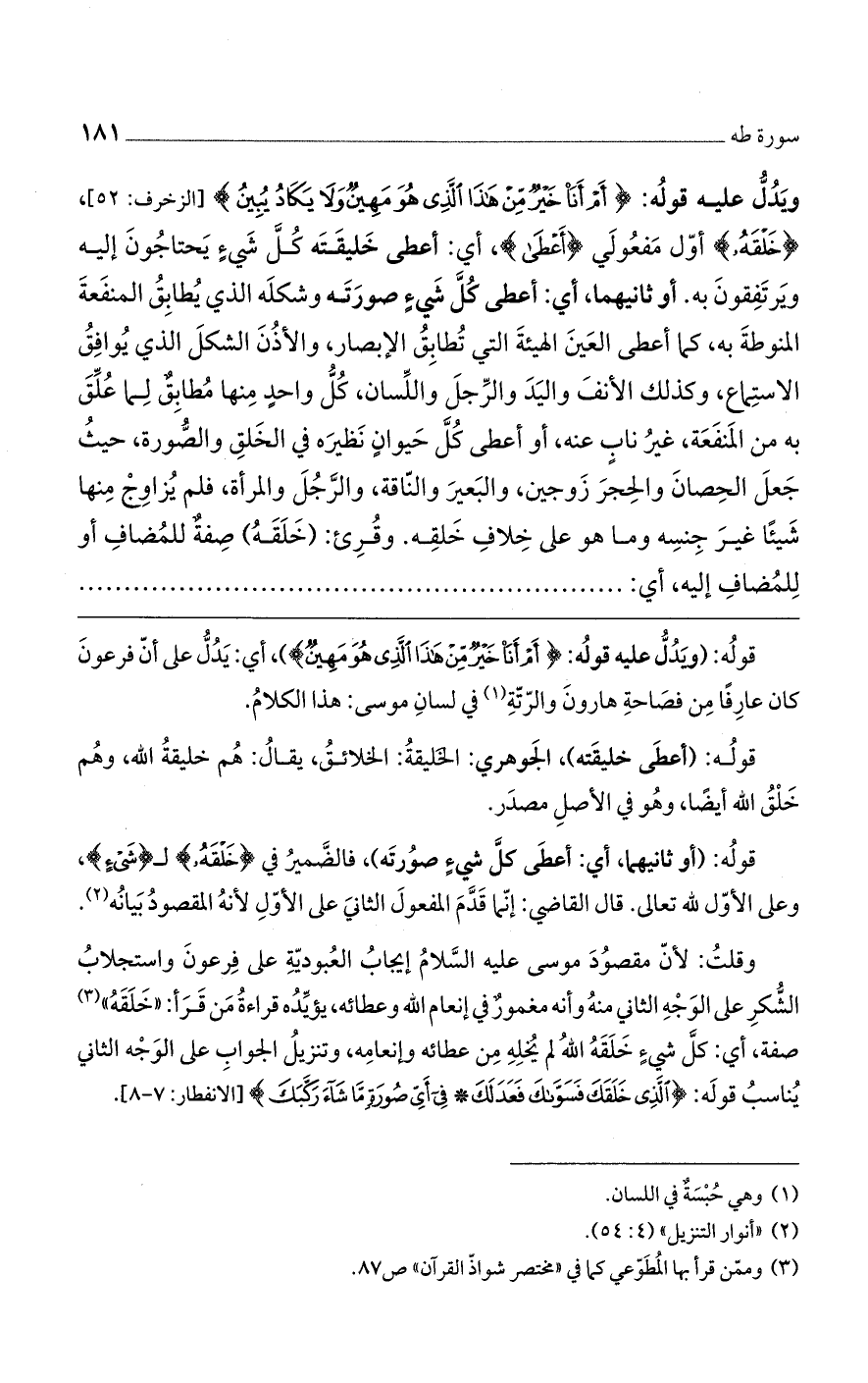 وقلتُ: لأن مقصود موسى عليه السلام إيجاب العبودية على فرعون واستجلابُ الشكر على الوجه الثاني منه وأنه مغمورٌ في إنعام الله وعطائه، يؤيده قراءة من قرأ: "خلقَهُ" صفة، أي: كل شيءٍ خلقه الله لم يخله من عطائه وإنعامه، وتنزيلُ الجواب على الوجه الثاني يناسب قوله: (الَّذِي خَلَقَكَ فَسَوَّاكَ فَعَدَلَكَ * فِي أَيِّ صُورَةٍ مَا شَاءَ رَكَّبَكَ) [الانفطار: 7 - 8].