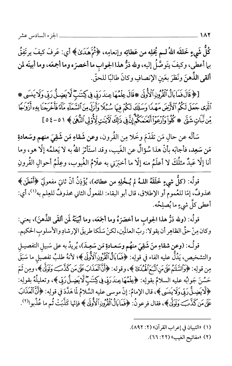 (قالَ فَما بالُ الْقُرُونِ الْأُولى (51) قالَ عِلْمُها عِنْدَ رَبِّي فِي كِتابٍ لا يَضِلُّ رَبِّي وَلا يَنْسى (52) الَّذِي جَعَلَ لَكُمُ الْأَرْضَ مَهْداً وَسَلَكَ لَكُمْ فِيها سُبُلاً وَأَنْزَلَ مِنَ السَّماءِ ماءً فَأَخْرَجْنا بِهِ أَزْواجاً مِنْ نَباتٍ شَتَّى (53) كُلُوا وَارْعَوْا أَنْعامَكُمْ إِنَّ فِي ذلِكَ لَآياتٍ لِأُولِي النُّهى) [طه: 51 - 54].