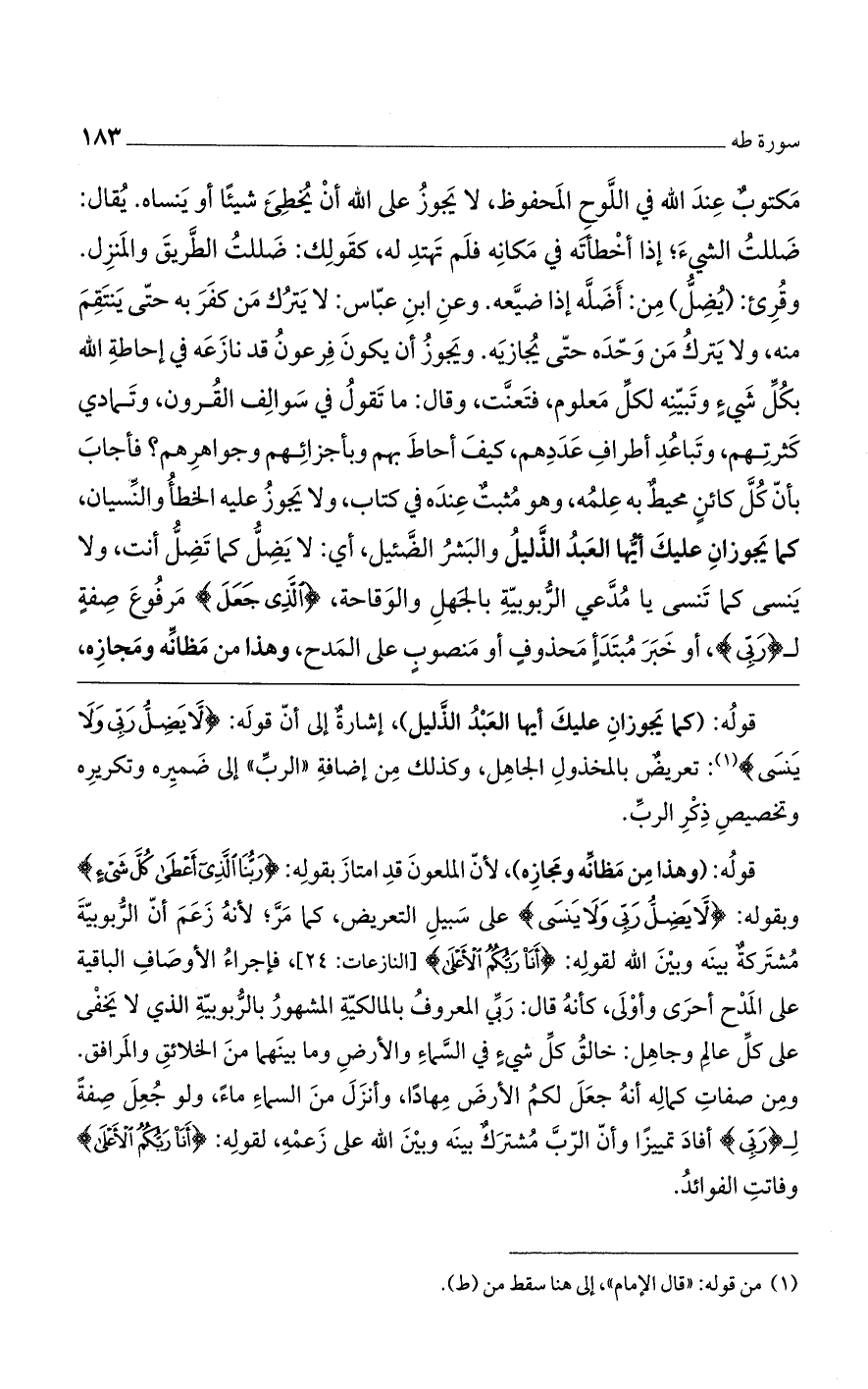 قوله: (كما يجوزان عليك أيها العبدُ الذليل)، إشارةٌ إلى أن قوله: (لا يَضِلُّ رَبِّي وَلا يَنسَى) على سبيل التعريض، كما مر؛ لأنه زعم أن الربوبية مشتركةٌ ينه وبين الله لقوله: (أَنَا رَبُّكُمْ الأَعْلَى) [النازعات: 24]، فإجراء الأوصاف الباقية على المدح أحرى وأولى، كأنه قال: ربي المعروفُ بالمالكية المشهور بالربوبية الذي لا يخفى على كل عالم وجاهل: خالقُ كل شيء في السماء والأرض وما بينهما من الخلائق والمرافق. ومن صفات كماله أنه جعل لكم الأرض مهاداً، وأنزل من السماء ماءً، ولو جُعل صفةً لـ (رَبِّي) أفاد تمييزاً وأن الرب مشتركٌ بينه وبين الله على زعمه، لقوله: (أَنَا رَبُّكُمْ الأَعْلَى) وفاتت الفوائد.