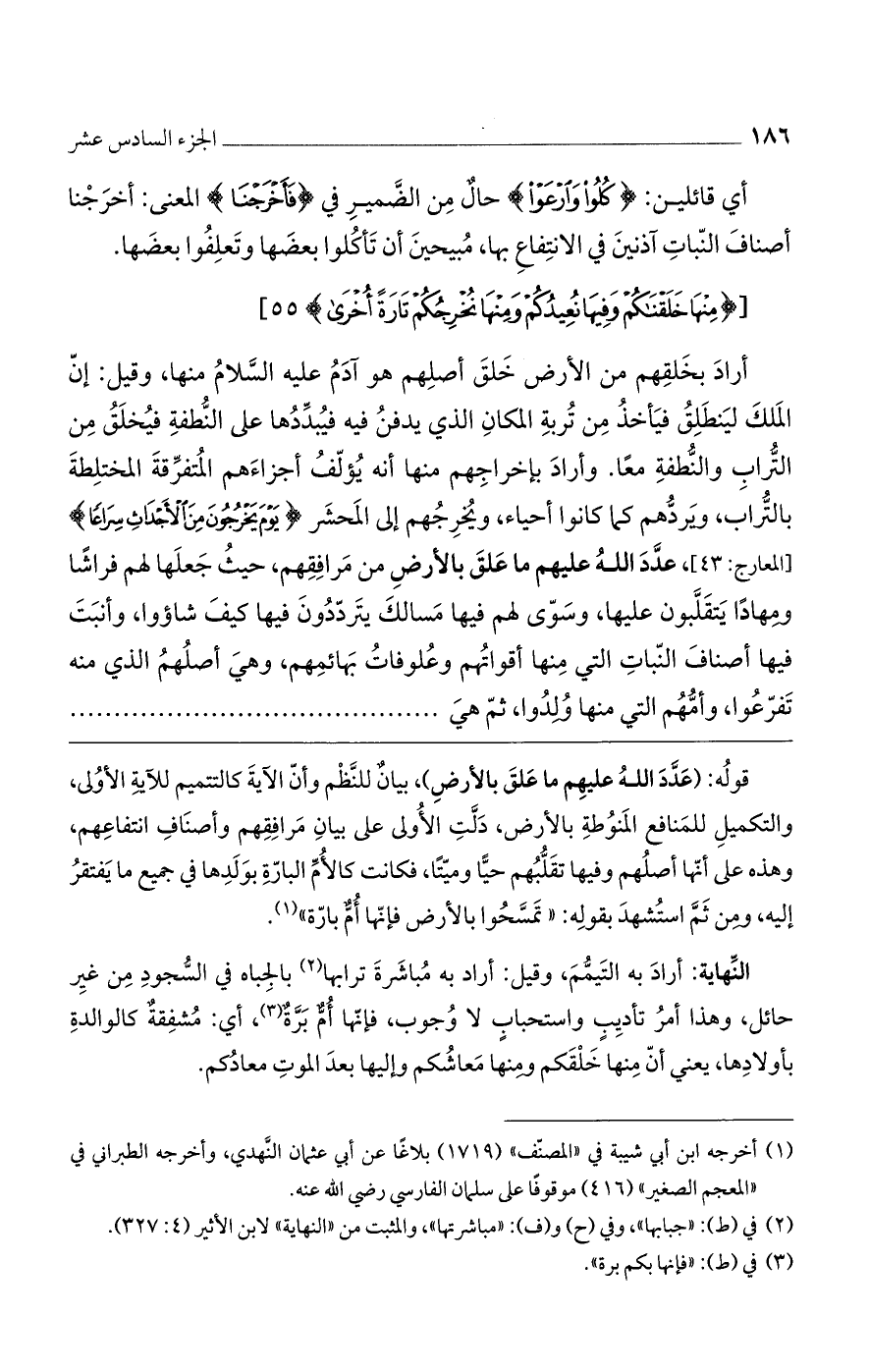 قوله: (عدد الله عليهم ما علق بالأرض)، بيانٌ للنظم وأن الآية كالتتميم للآية الأولى، والتكميل للمنافع المنوطة بالأرض، دلت الأولى على بيان مرافقهم وأصناف انتفاعهم، وهذه على أنها أصلهم وفيها تقلبهم حياً وميتاً، فكانت كالأم البارة بولدها في جميع ما يفتقر إليه، ومن ثم استشهد بقوله: "تمسحوا بالأرض فإنها أم بارة".