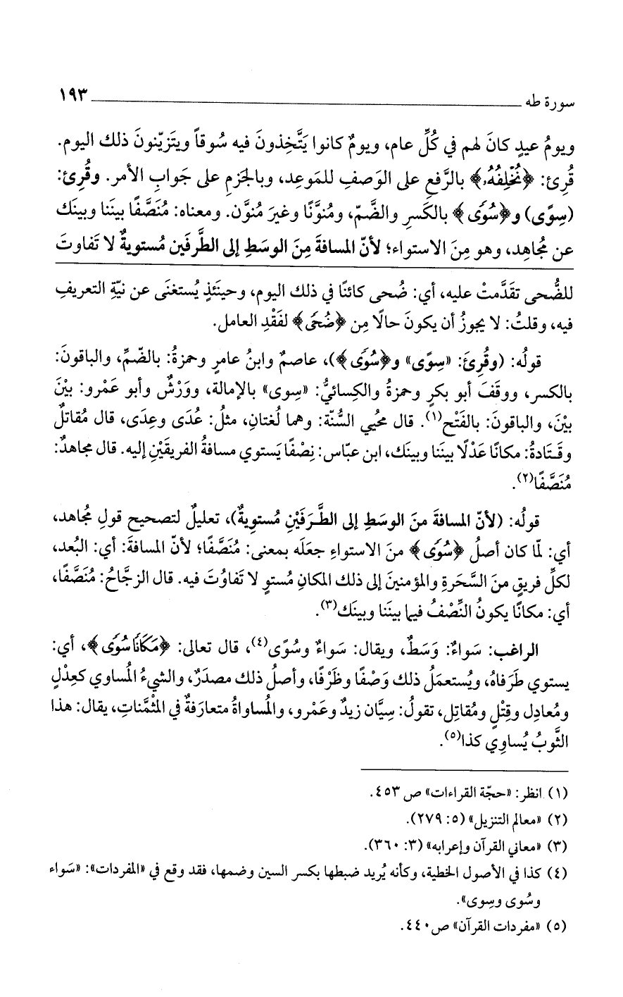 قوله: (لأن المسافة من الوسط إلى الطرفين مستوية)، تعليلٌ لتصحيح قول مجاهد، أي: لما كان أصل (سُوىً) من الاستواء جعله بمعنى: منصفاً؛ لأن المسافة: أي: البعد، لكل فريق من السحرة والمؤمنين إلى ذلك المكان مُستوٍ لا تفاوت فيه. قال الزجاج: منصفاً، أي: مكاناً يكون النصفُ فيما بيننا وبينك.