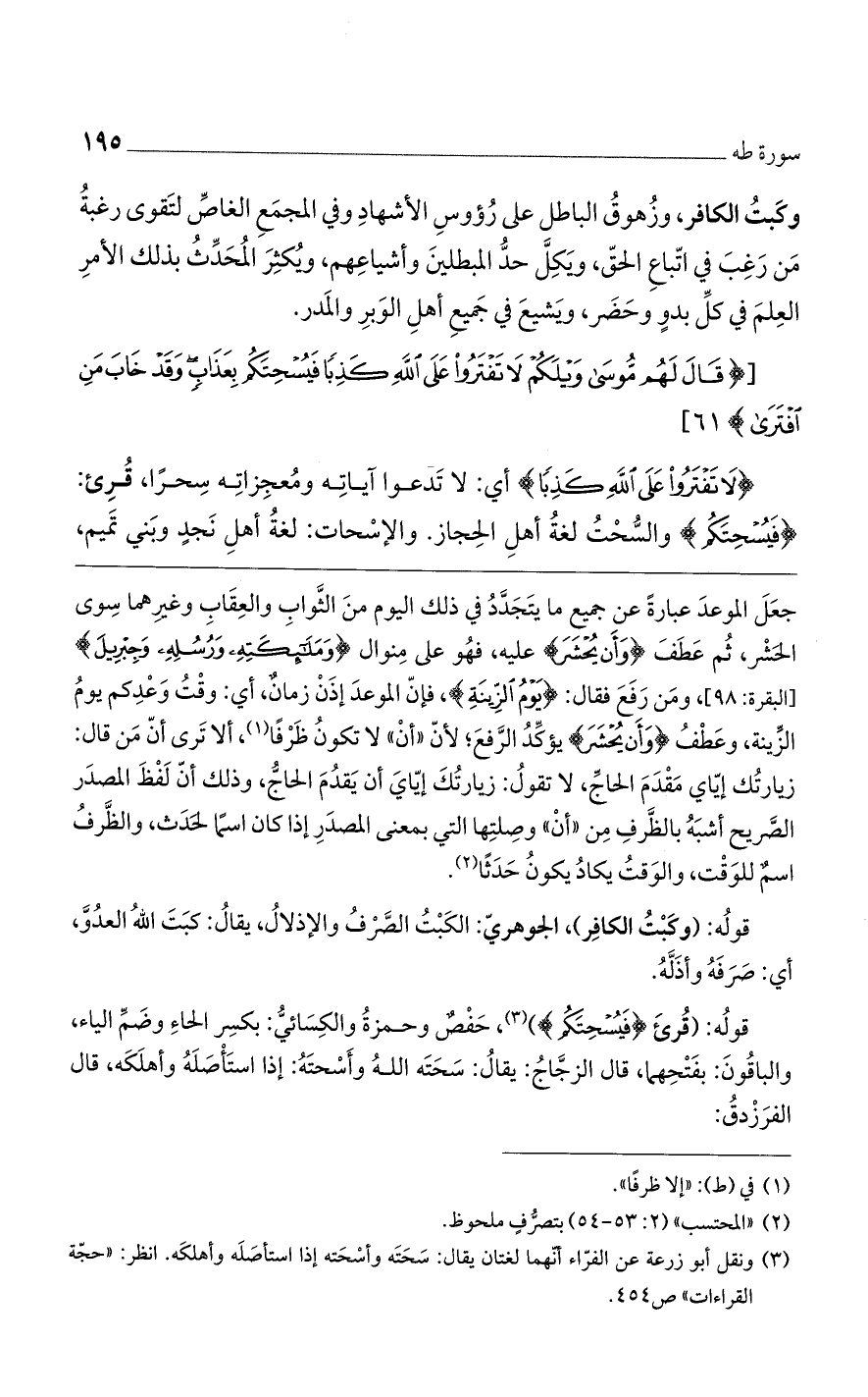 قوله: (قُرئ (فَيُسْحِتَكُمْ))، حفصٌ وحمزة والكسائي: بكسر الحاء وضم الياء، والباقون: بفتحها، قال الزجاج: يقال: سحته الله وأسحته: إذا استأصله وأهلكه، قال الفرزدق: