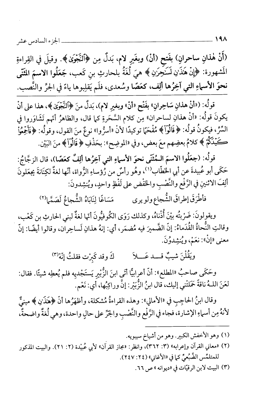 (أن هذان ساحران): بفتح (أن) وبغير لام، بدل من (النجوى). وقيل في القراءة المشهورة (إِنْ هذانِ لَساحِرانِ) هي لغة بلحارث بن كعب، جعلوا الاسم المثنى نحو الأسماء التي آخرها ألف، كعصا وسعدى، فلم يقلبوها ياء في الجر والنصب.