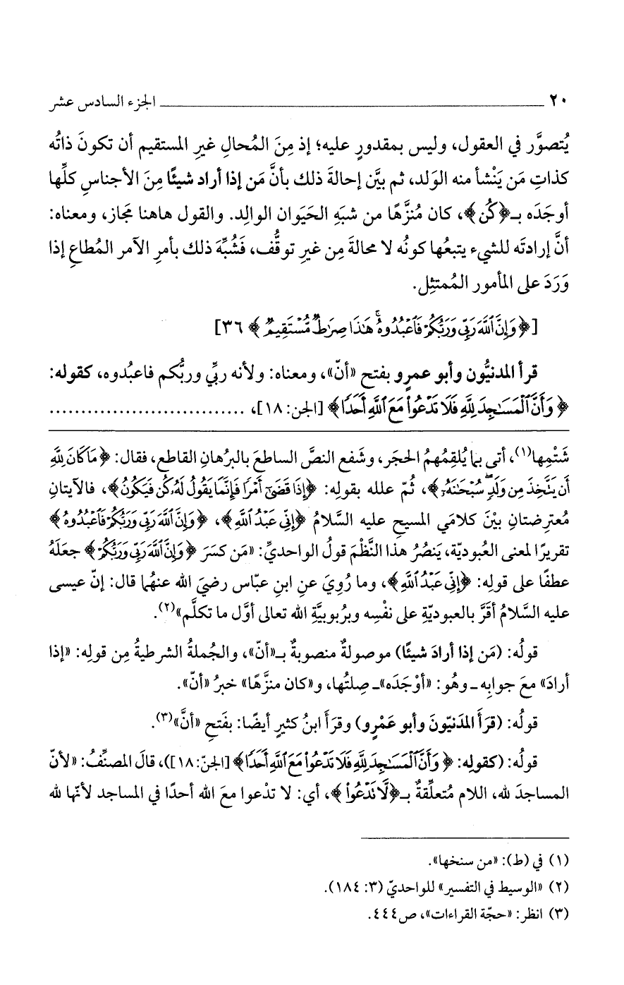 شتمها، أتى بما يلقمهم الحجر، وشفع النص الساطع بالبرهان القاطع، فقال: (مَا كَانَ لِلَّهِ أَن يَتَّخِذَ مِن ولَدٍ سُبْحَانَهُ)، ثم علله بقوله: (إذَا قَضَى أَمْرًا فَإنَّمَا يَقُولُ لَهُ كُن فَيَكُونُ)، فالآيتان معترضتان بين كلامي المسيح عليه السلام (إنِّي عَبْدُ اللَّهِ)، (وإنَّ اللَّهَ رَبِّي ورَبُّكُمْ فَاعْبُدُوهُ) تقريراً لمعنى العبودية، ينصر هذا النظم قول الواحدي: ((من كسر (وإنَّ اللَّهَ رَبِّي ورَبُّكُمْ) جعله عطفاً على قوله: (إنِّي عَبْدُ اللَّهِ)، وما روي عن ابن عباس رضي الله عنهما قال: إن عيسى عليه السلام أقر بالعبودية على نفسه وبربوبية الله تعالى أول ما تكلم)).