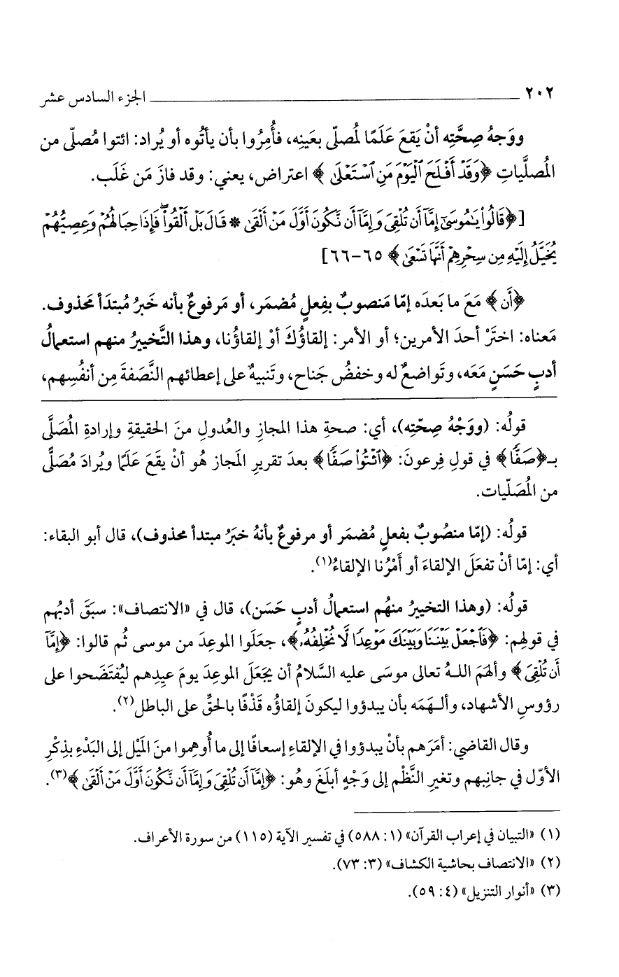 قوله: (وهذا التخيير منهم استعمال أدب حسن)، قال في "الانتصاف": سبق أدبهم في قولهم: فَاجْعَلْ بَيْنَنَا وَبَيْنَكَ مَوْعِداً لا نُخْلِفُهُ)، جعلوا الموعد من موسى ثم قالوا: (إِمَّا أَنْ تُلْقِيَ) وألهم الله تعالى موسى عليه السلام أن يجعل الموعد يوم عيدهم ليفتضحوا على رؤوس الأشهاد، وألهمه بأن يبدؤوا ليكون إلقاؤه قذفاً بالحق على الباطل.