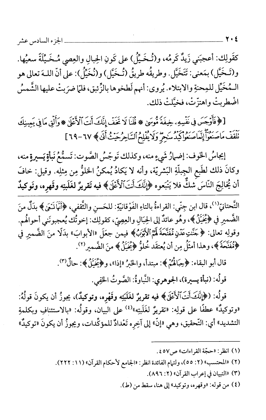 التحتاني، قال ابن جني: القراءة بالتاء الفوقانية: للحسن والثقفي، (أَنَّهَا تَسْعَى) بدلٌ من الضمير في (يُخَيَّلُ)، وهو عائدٌ إلى الحبال والعصي، كقول: إخوتك يعجبونني أحوالهم. وقوله تعالى: (جَنَّاتِ عَدْنٍ مُفَتَّحَةً لَهُمْ الأَبْوَابُ) فيمن جعل "الأبواب" بدلاً من الضمير في (مُفَتَّحَةً)، وهذا أمثل من أن يعتقد خلوُّ (يُخَيَّلُ) من الضمير.