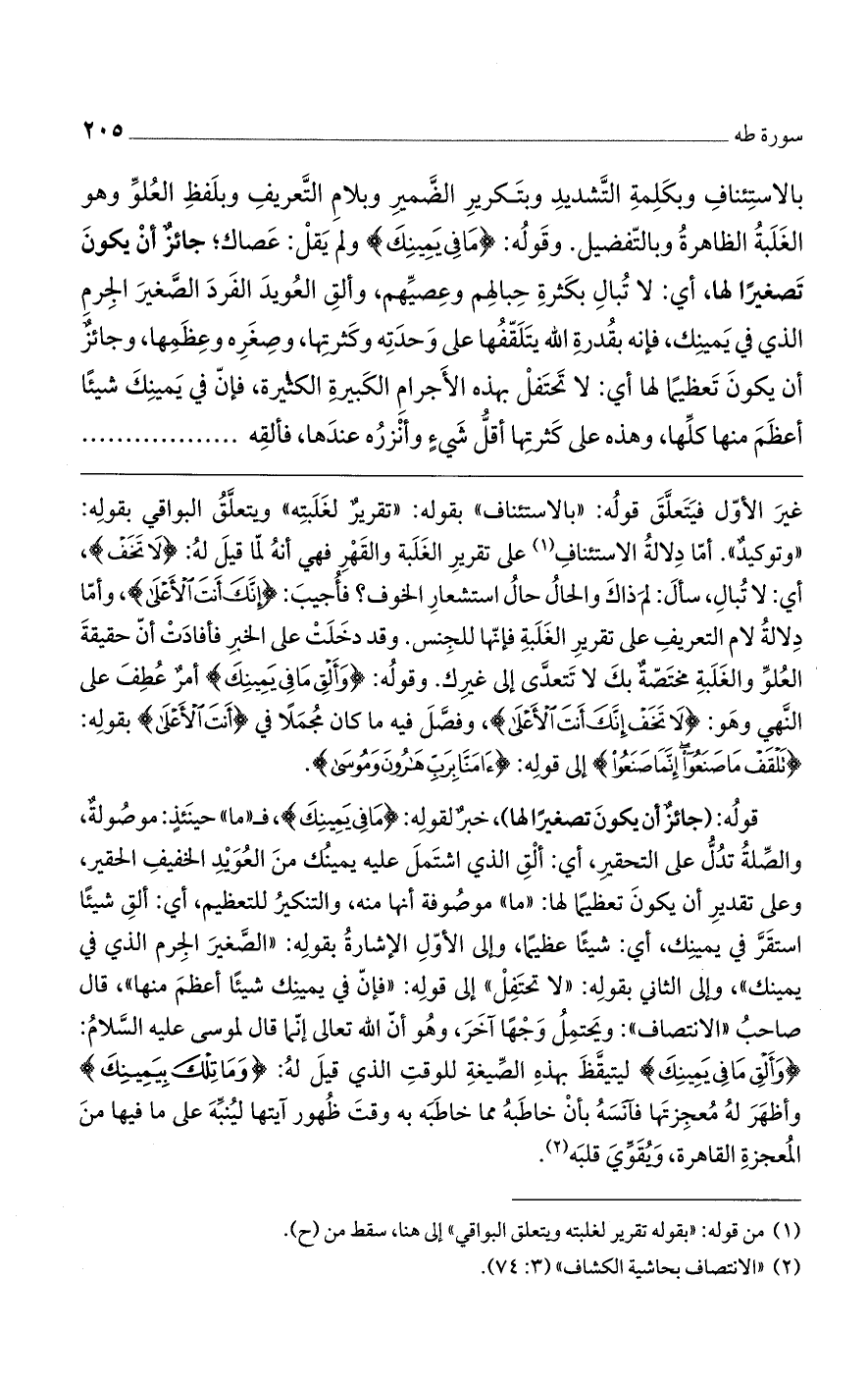 غير الأول فيتعلق قوله: "بالاستئناف" بقوله: "تقريرٌ لغلبته" ويتعلقُ البواقي بقوله: "وتوكيدٌ". أما دلالةُ الاستئناف على تقرير الغلبة والقهر فهي أنه لما قيل له: (لا تَخَفْ)، أي: لا تُبالِ، سأل: لم ذاك والحالُ حالُ استشعار الخوف؟ فأجيب: (إِنَّكَ أَنْتَ الأَعْلَى)، وأما دلالة لام التعريف على تقرير الغلبة فإنها للجنس. وقد دخلت على الخبر فأفادت أن حقيقة العُلو والغلبة مختصةٌ بك لا تتعدى إلى غيرك. وقوله: (وَأَلْقِ مَا فِي يَمِينِكَ) أمرٌ عُطف على النهي وهو: (لا تَخَفْ إِنَّكَ أَنْتَ الأَعْلَى)، وفصل فيه ما كان مجملاً في (أَنْتَ الأَعْلَى) بقوله: (تَلْقَفْ مَا صَنَعُوا إِنَّمَا صَنَعُوا) إلى قوله: 0 آمَنَّا بِرَبِّ هَارُونَ وَمُوسَى).