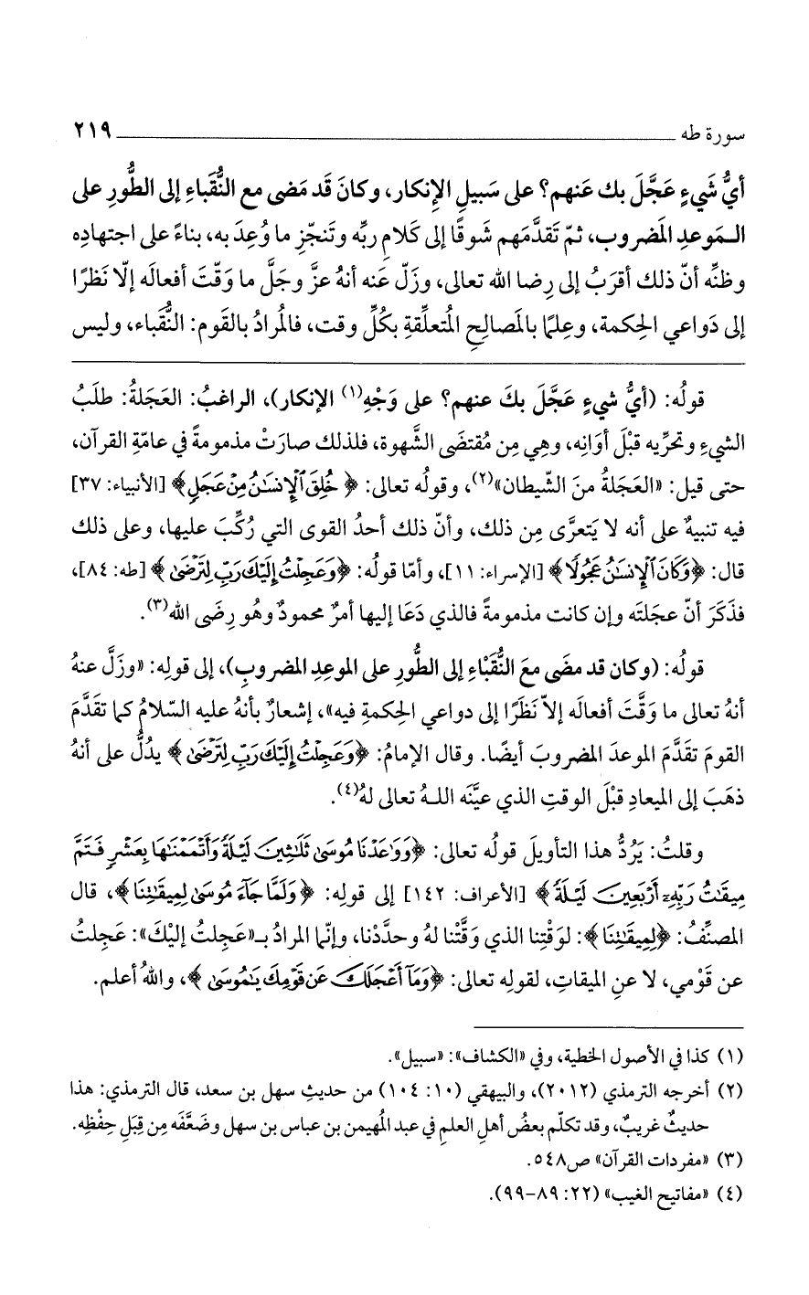 وقلت: يرد هذا التأويل قوله تعالى: (وَوَاعَدْنَا مُوسَى ثَلاثِينَ لَيْلَةً وَأَتْمَمْنَاهَا بِعَشْرٍ فَتَمَّ مِيقَاتُ رَبِّهِ أَرْبَعِينَ لَيْلَةً) [الأعراف: 142] إلى قوله: (وَلَمَّا جَاءَ مُوسَى لِمِيقَاتِنَا)، قال المصنف: (لِمِيقَاتِنَا): لوقتنا الذي وقتنا له وحددنا، وإنما المراد بـ"عجلتُ إليك": عجلتُ عن قومي، لا عن المقيات، لقوله تعالى: (وَمَا أَعْجَلَكَ عَنْ قَوْمِكَ يَا مُوسَى)، والله أعلم.
