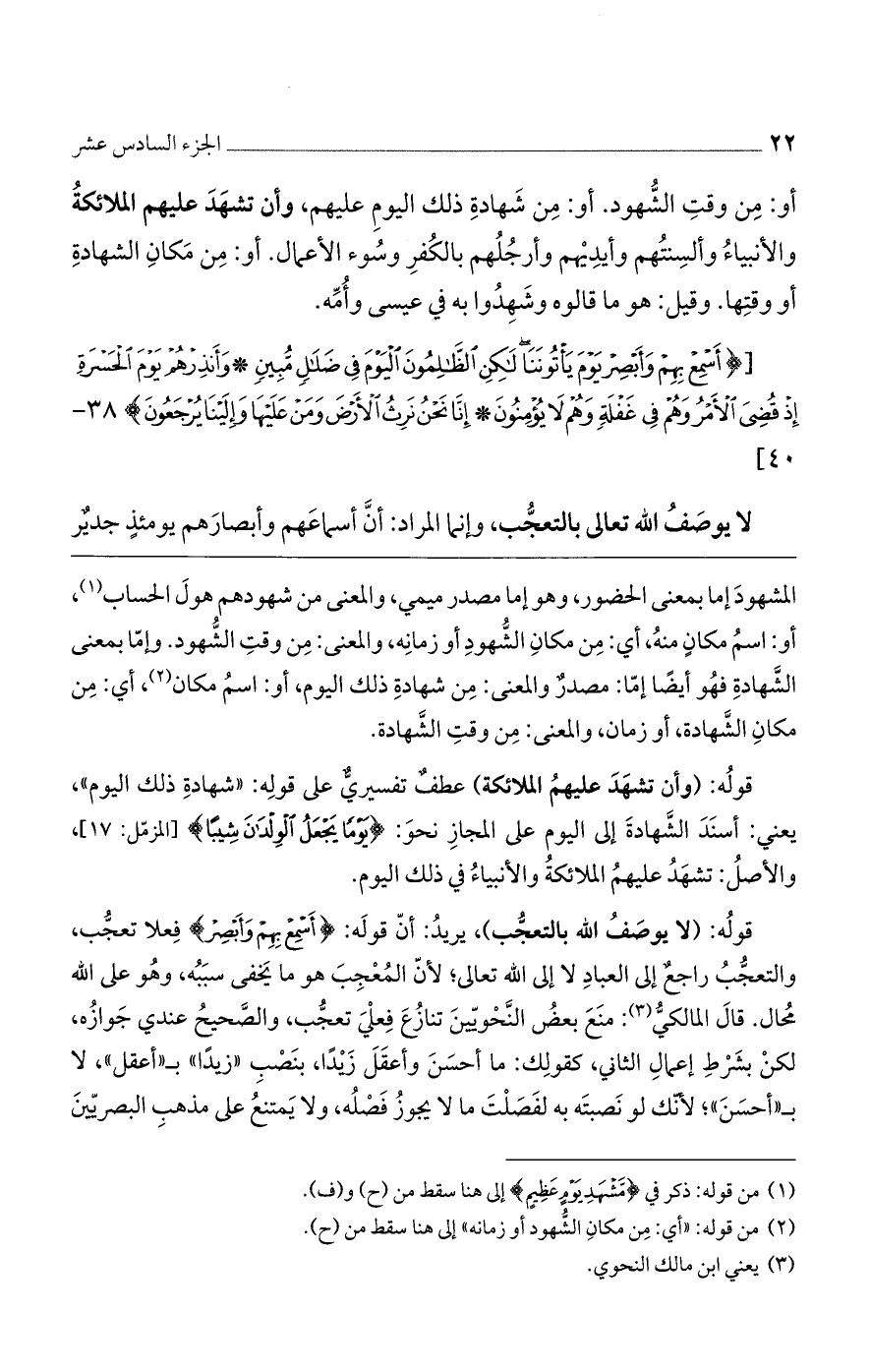 قوله: (لا يوصف الله بالتعجب)، يريد: أن قوله: (أَسْمِعْ بِهِمْ وأَبْصِرْ) فعلا تعجب، والتعجب راجعٌ إلى العباد لا إلى الله تعالى؛ لأن المعجب هو ما يخفى سببه، وهو على الله محال. قال المالكي: منع بعض النحويين تنازع فعلي تعجب، والصحيح عندي جوازه، لكن بشرط إعمال الثاني، كقولك: ما أحسن وأعقل زيداً، بنصب ((زيداً)) ب ((أعقل))، لا ب ((أحسن))؛ لأنك لو نصبته به لفصلت ما لا يجوز فصله، ولا يمتنع على مذهب البصريين
