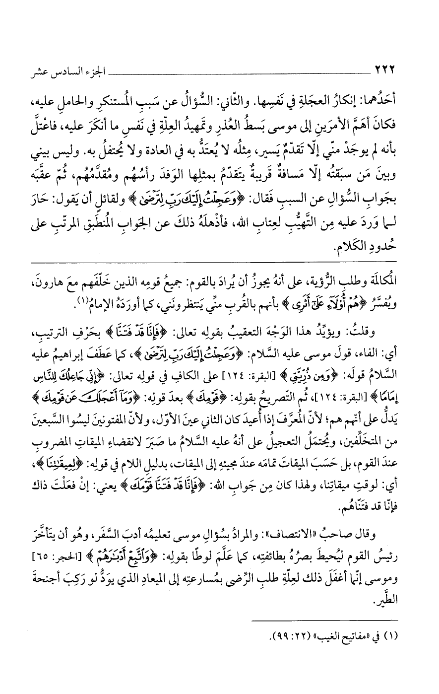 المكالمة وطلب الرؤية، على أنه يجوز أن يُراد بالقوم: جميعُ قومه الذين خلفهم مع هارون، ويفسرُ (هُمْ أُولاءِ عَلَى أَثَرِي) بأنهم بالقرب مني ينتظرونني، كما أورده الإمام.