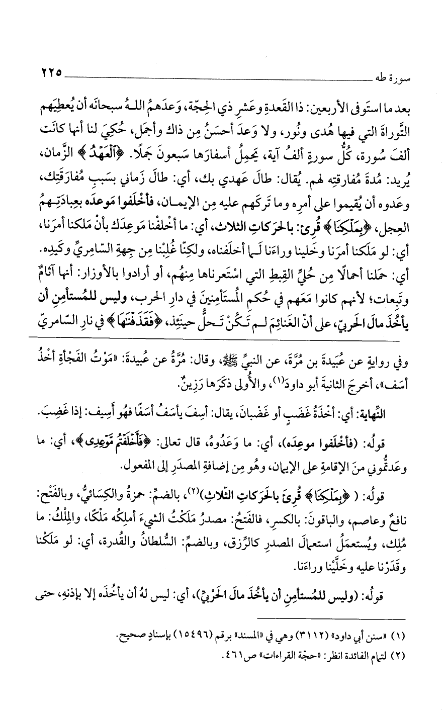 بعد ما استوفى الأربعين: ذا القعدة وعشر ذى الحجة. وعدهم الله سبحانه أن يعطيهم التوراة التي فيها هدى ونور، ولا وعد أحسن من ذاك وأجمل، حكى لنا أنها كانت ألف سورة كل سورة ألف آية، يحمل أسفارها سبعون جملا (الْعَهْدُ) الزمان، يريد: مدّة مفارقته لهم. يقال: طال عهدى بك، أى: طال زماني بسبب مفارقتك. وعدوه أن يقيموا على أمره وما تركهم عليه من الإيمان، فأخلفوا موعده بعبادتهم العجل (بِمَلْكِنا) قرئ بالحركات الثلاث، أى: ما أخلفنا موعدك بأن ملكنا أمرنا، أي: لو ملكنا أمرنا وخلينا وراءنا لما أخلفناه، ولكنا غلبنا من جهة السامري وكيده. أى: حملنا أحمالا من حلىّ القبط التي استعرناها منهم. أو أرادوا بالأوزار: أنها آثام وتبعات، لأنهم كانوا معهم في حكم المستأمنين في دار الحرب. وليس للمستأمن أن يأخذ مال الحربي، على أن الغنائم لم تكن تحل حينئذ (فَقَذَفْناها) في نار السامري