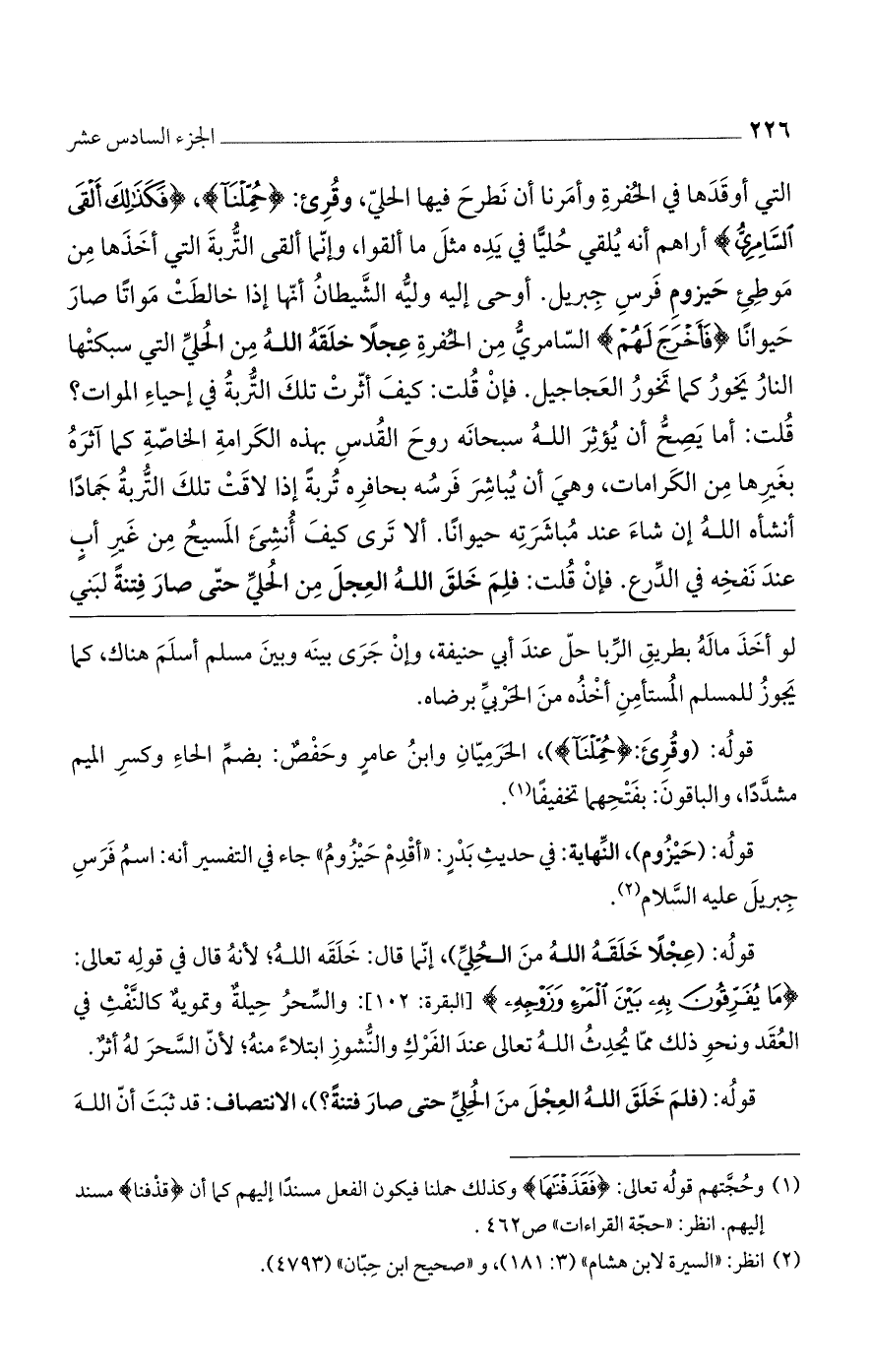 قوله: (حيزوم)، النهاية: في حديث بدرٍ: "أقدم حيزومُ" جاء في التفسير أنه: قال في قوله تعالى: (مَا يُفَرِّقُونَ بِهِ بَيْنَ الْمَرْءِ وَزَوْجِهِ) [البقرة: 102]: والسحرُ حيلةٌ وتمويهٌ كالنفث في العقد ونحو ذلك مما يُحدثُ الله تعالى عند الفرك والنشوز ابتلاءً منه؛ لأن السحر له أثرٌ.