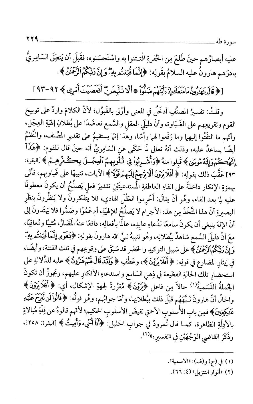 وقلتُ: تفسيرُ المصنفِ أدخلُ في المعنى وأولى بالقبول؛ لأن الكلام واردٌ على توبيخ القوم وتقريعهم على الغباوة، وأن دليلي العقل والسمع تعاضدا على بطلان إلهية العجل، وأنهم ما التفتوا إليهما وما رفعوا لهما رأساً، وهذا إنما يستقيم على تقدير المصنف، والنظمُ أيضاً يساعد عليه، وذلك أنه تعالى لما حكى عن السامري أنه حين قال للقوم: (هَذَا إِلَهُكُمْ وَإِلَهُ مُوسَى) قبلوا منه (وَأُشْرِبُوا فِي قُلُوبِهِمْ الْعِجْلَ بِكُفْرِهِمْ) [البقرة: 93] عقب ذلك بقوله: (أَفَلا يَرَوْنَ أَلاَّ يَرْجِعُ إِلَيْهِمْ قَوْلاً) الآيات، تنبيهاً على غباوتهم، فأتى بهمزة الإنكار داخلةً على الفاء العاطفة المستدعيتين تقدير فعلٍ يصلُحُ أن يكون معطوفاً عليه لما بعد الفاء، وهو أن يقال: أحرموا العقل الهادي، فلا يتفكرون ولا ينظرون بنظر البصيرة أن هذا المتخذ نم هذه الأجرام لا يصلح للإلهية، أم عموا وصموا فلا يهتدون إلى أن الإله ينبغي أن يكون سامعاً لدعاء عابده، عالماً بأفعاله، دافعاً عنه المضار، مثيباً ومعاقباً، مع أن دليل السمع شاهدٌ ببطلانه، وهو تنبيهُ نبي الله هارون بقوله: (يَا قَوْمِ إِنَّمَا فُتِنتُمْ بِهِ وَإِنَّ رَبَّكُمْ الرَّحْمَنُ) على سبيل التوكيد والحصر قد سبق على وقوعهم في تلك الفتنة، وأيضاً، في إيثار المضارع في قوله: (أَفَلا يَرَوْنَ)، وعطفِ (وَلَقَدْ قَالَ لَهُمْ هَارُونُ) عليه للدلالة على استحضار تلك الحالة الفظيعة في ذهن السامع واستدعاء الأفكار عليهم، ويجوز أن تكون الجملة القسمية حالاً من فاعل (يَرَوْنَ) مقررةً لجهة الإشكال، أي: (أَفَلا يَرَوْنَ) والحالُ أن هارون نبههم قبل ذلك ببطلانها، وأما جوابهم، وهو قوله: (قَالُوا لَنْ نَبْرَحَ عَلَيْهِ عَاكِفِينَ) فمن باب الأسلوب الأحمق نقيض الأسلوب الحكيم؛ لأنهم قالوه عن قلة مبالاةٍ بالأدلة الظاهرة، كما قال نمرود في جواب الخليل: (أَنَا أُحْيِي وَأُمِيتُ) [البقرة: 258]، وذكر القاضي الوجهين في "تفسيره".