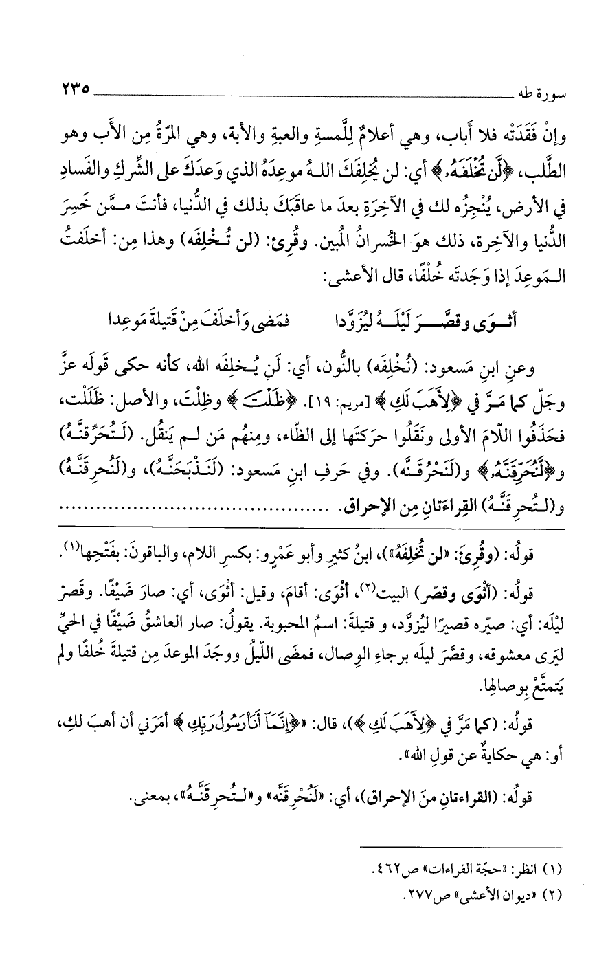 وعن ابن مسعود: (نخلفه)، بالنون، أى: لن يخلفه الله، كأنه حكى قوله عز وجل كما مر في (لِأَهَبَ لَكِ)] مريم: 19 [. (ظَلْتَ) وظلت، وظلت والأصل ظللت، فحذفوا اللام الأولى ونقلوا حركتها إلى الظاء، ومنهم من لم ينقل (لَنُحَرِّقَنَّهُ) و (لنحرقنه) و (لنحرقنه). وفي حرف ابن مسعود: (لنذبحنه)، و (لنحرقنه)، و (لتحرقنه): القراءتان من الإحراق.
