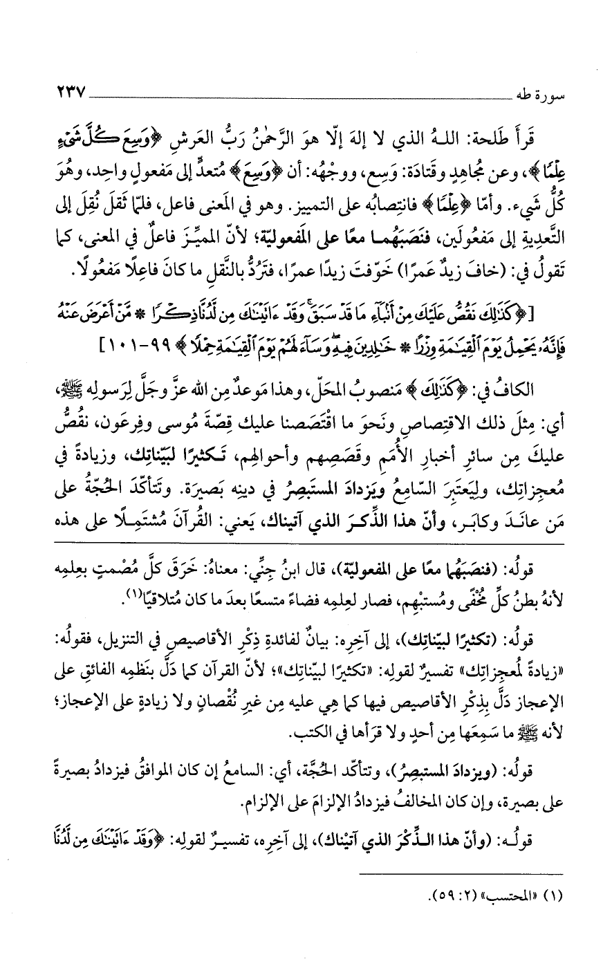 الكاف في (كَذلِكَ) منصوب المحل، وهذا موعد من الله عزّ وجل لرسوله صلى الله عليه وسلم، أى: مثل ذلك الاقتصاص ونحو ما اقتصصنا عليك قصة موسى وفرعون، نقصّ عليك من سائر أخبار الأمم وقصصهم وأحوالهم، تكثيرا لبيناتك، وزيادة في معجزاتك، وليعتبر السامع ويزداد المستبصر في دينه بصيرة، وتتأكد الحجة على من عاند وكابر، وأن هذا الذكر الذي آتيناك يعنى القرآن مشتملا على هذه