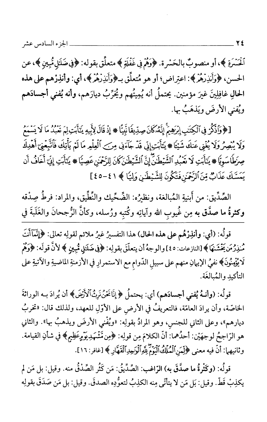 قوله: (وأنه يفني أجسادهم) أي: يحتمل (إنَّا نَحْنُ نَرِثُ الأَرْضَ) أن يراد به الوراثة الخاصة، وأن يراد العامة، فالتعريف في الأرض على الأول للعهد، ولذلك قال: ((تخرب ديارهم))، وعلى الثاني للجنس، وهو المراد بقوله: ((ويفني الأرض ويذهب بها)). والثاني هو الراجح لوجهين: أحدهما: أن الكلام من قوله: (مِن مَّشْهَدِ يَوْمٍ عَظِيمٍ) في شأن القيامة. وثانيهما: أن فيه معنى (لِّمَنِ المُلْكُ اليَوْمَ لِلَّهِ الوَاحِدِ القَهَّارِ) [غافر: 16].