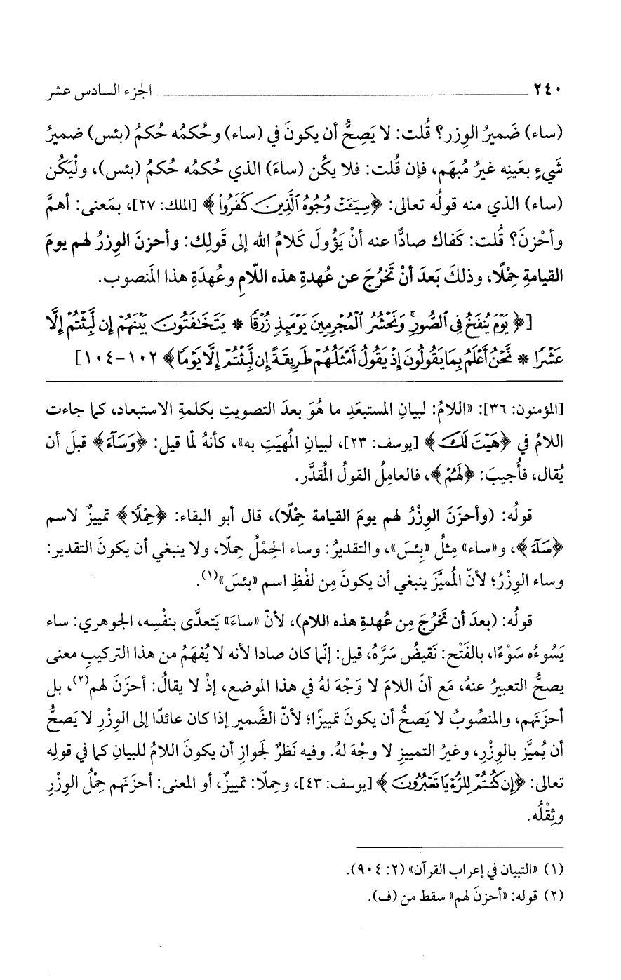 (ساء) ضمير الوزر؟ قلت: لا يصح أن يكون في (ساء) وحكمه حكم (بئس) ضمير شيء بعينه غير مبهم فإن قلت: فلا يكن (ساء) الذي حكمه حكم (بئس)، وليكن (ساء) الذي منه قوله تعالى (سِيئَتْ وُجُوهُ الَّذِينَ كَفَرُوا)] الملك: 27 [، بمعنى أهم وأحزن؟ قلت: كفاك صادّا عنه أن يؤول كلام الله إلى قولك: وأحزن الوزر لهم يوم القيامة حملا، وذلك بعد أن تخرج عن عهدة هذه اللام وعهدة هذا المنصوب.