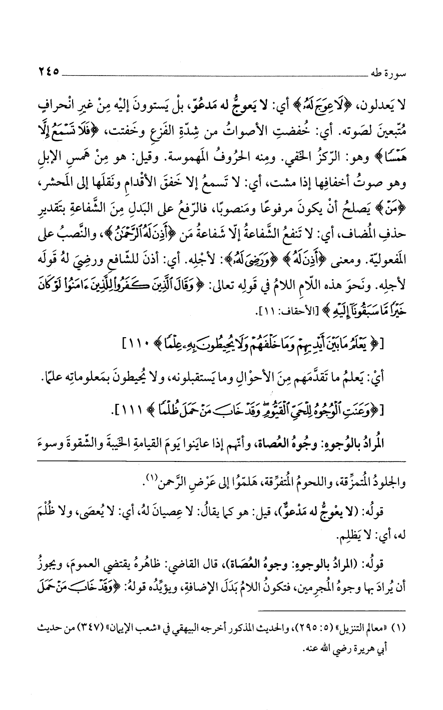 لا يعدلون (لا عِوَجَ لَهُ) أى لا يعوجّ له مدعوّ، بل يستوون إليه من غير انحراف متبعين لصوته. أى: خفضت الأصوات من شدة الفزع وخفتت (فَلا تَسْمَعُ إِلَّا هَمْساً) وهو الركز الخفي. ومنه الحروف المهموسة. وقيل: هو من همس الإبل وهو صوت أخفافها إذا مشت، أى: لا تسمع إلا خفق الأقدام ونقلها إلى المحشر (مَنْ) يصلح أن يكون مرفوعا ومنصوبا، فالرفع على البدل من الشفاعة بتقدير حذف المضاف، أى: لا تنفع الشفاعة إلا شفاعة من (أَذِنَ لَهُ الرَّحْمنُ) والنصب على المفعولية. ومعنى (أذن له) (وَرَضِيَ لَهُ) لأجله. أى: أذن للشافع ورضى قوله لأجله. ونحو هذه اللام اللام في قوله تعالى (وَقالَ الَّذِينَ كَفَرُوا لِلَّذِينَ آمَنُوا لَوْ كانَ خَيْراً ما سَبَقُونا إِلَيْهِ) [الأحقاف: 11].